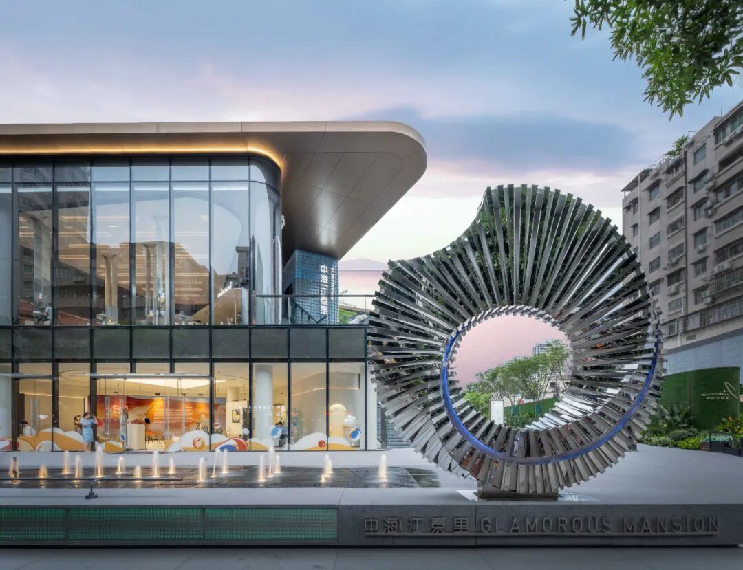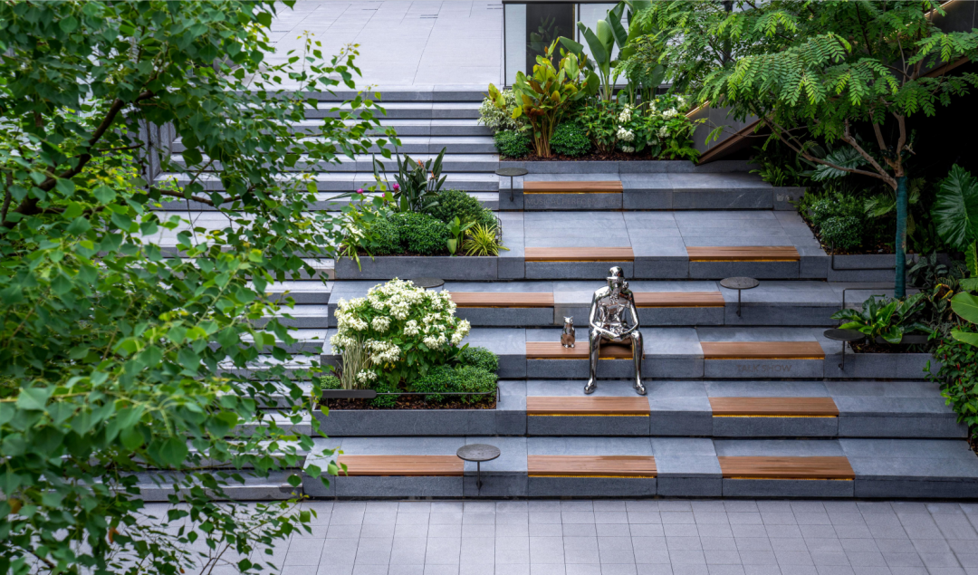 在下沉剧场的台阶上,艺术雕塑静默于此,