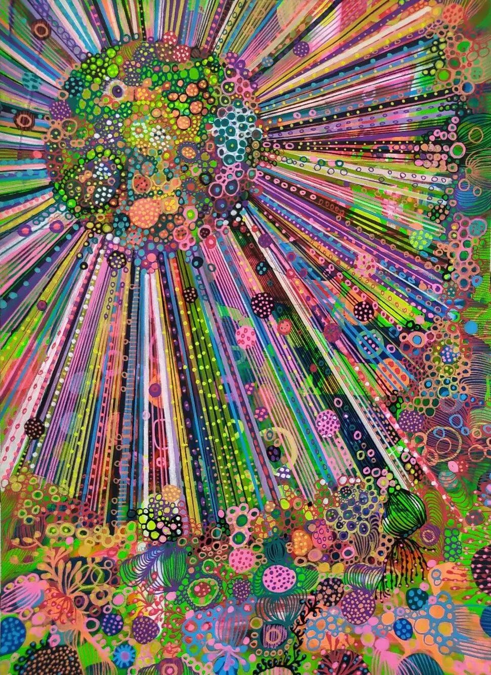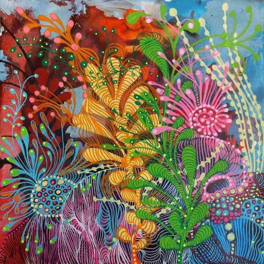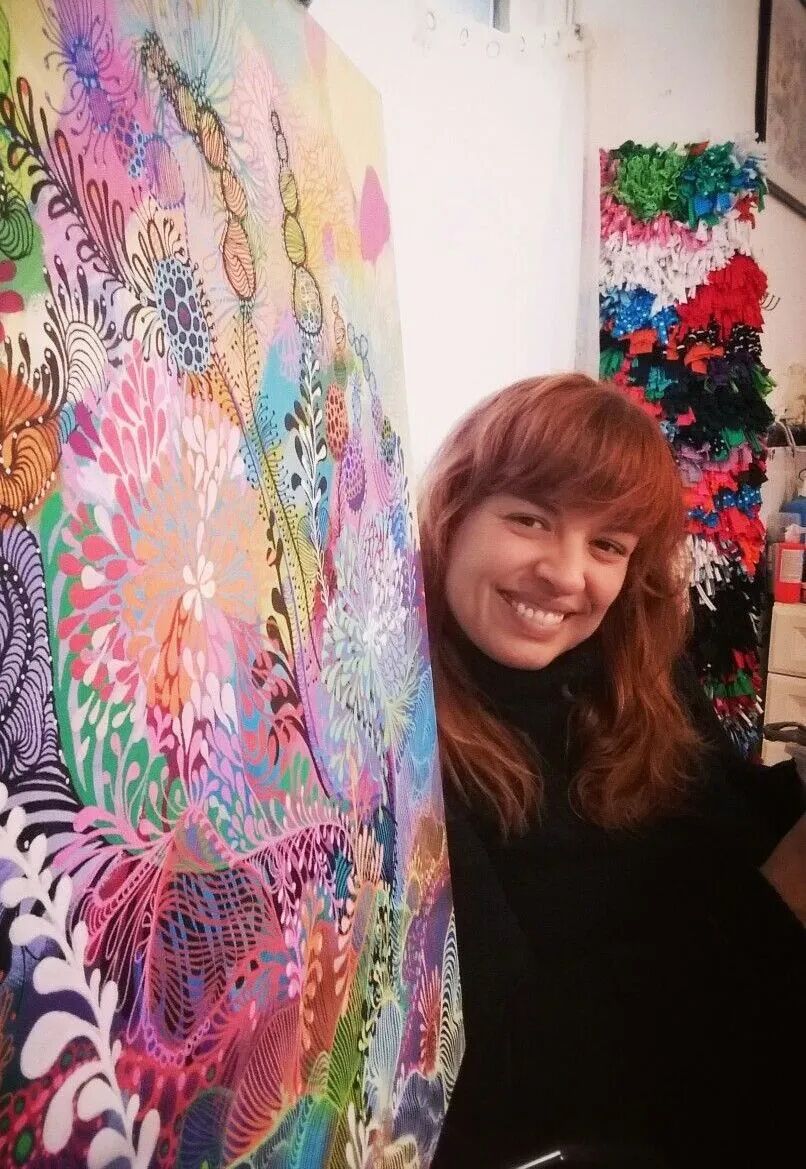 她说:“我所做的工作是一种暴露内部空间的方式,我需要每天去参观以平息内心的自我。这些空间受到各种形状的自然的影响,但最重要的是受到海洋和植物景观的影响。因此,在我的绘画中,我使用丙烯和酒精墨水绘制的鲜艳色彩作为抽象基础,我直观地放置形成我内心所见风景的线条。”