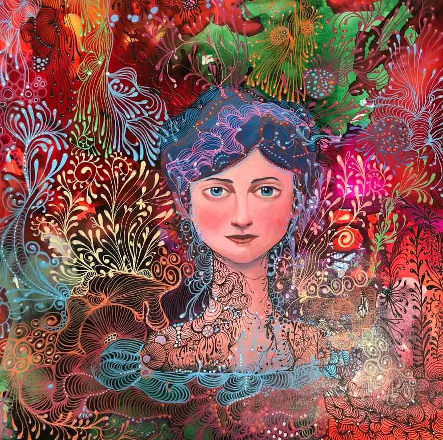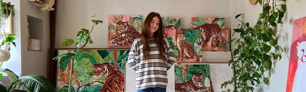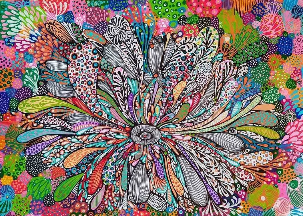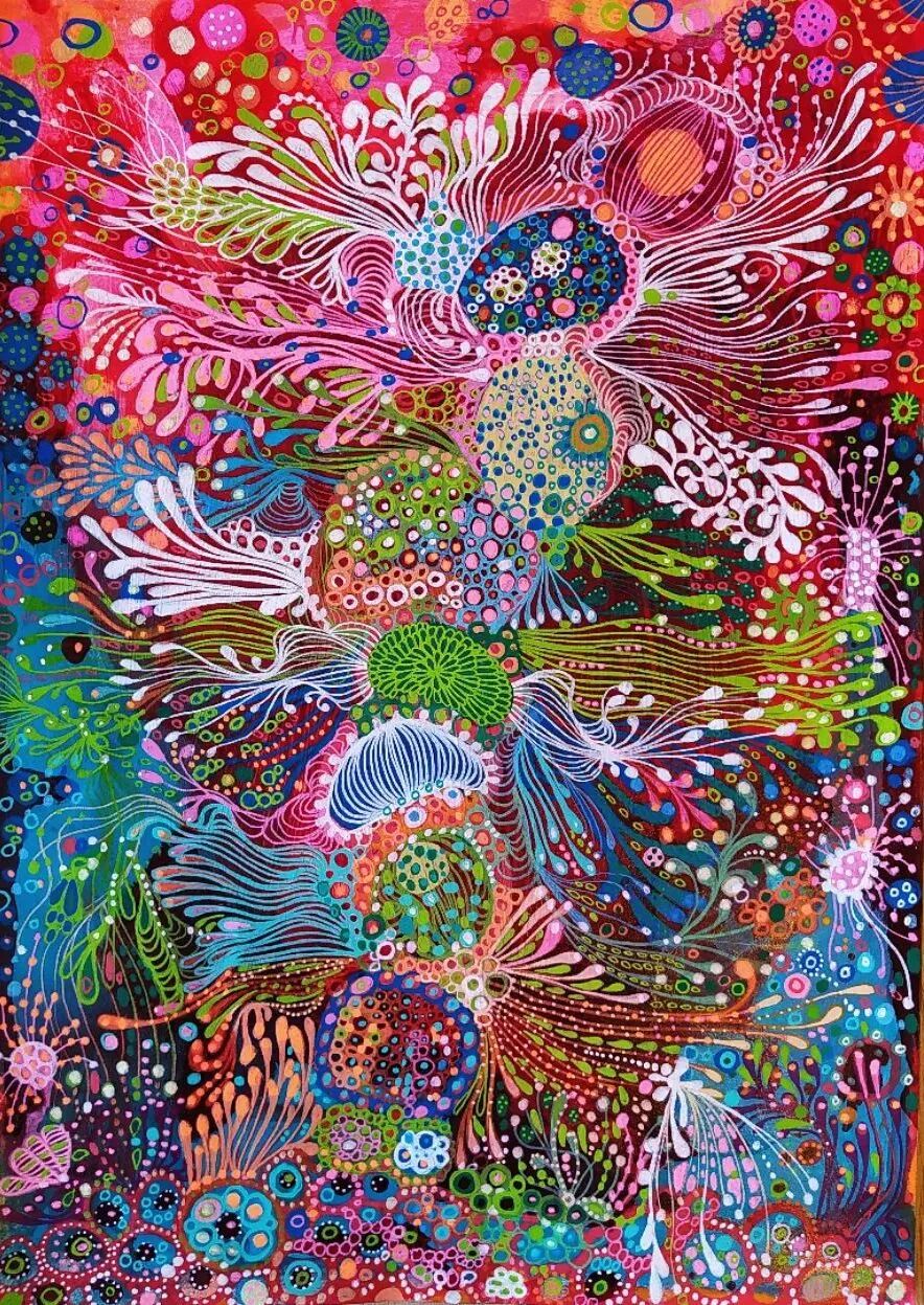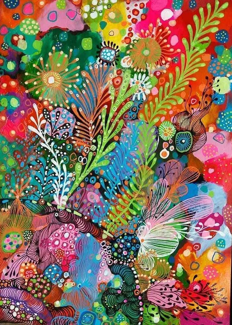 Noemi Ibarz的作品具有抽象性质,大量运用大自然与海洋生物的曲线造型,其中大部分灵感来自她对大海的热爱。她擅长结合有机线条、圆点和鲜明的色彩,欣欣向荣的生命被她化作象征式的符码,并融合清晰炫丽的色彩呈现,后来娴熟大胆地将人物、动物造型嵌入其中,充满活力也让观者心情愉悦,非常疗愈。