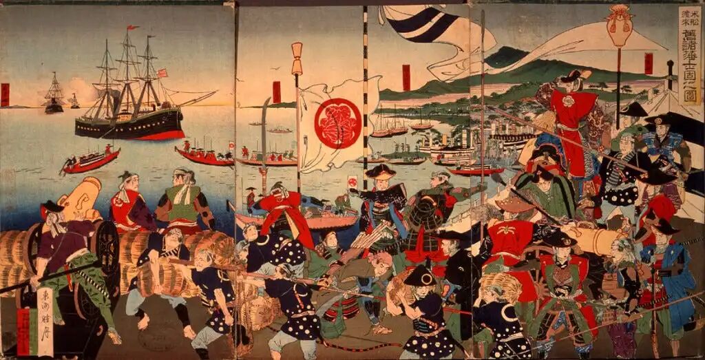 同样在1853年时,日本也发生了著名的“黑船事件”,美国人同样以炮舰威逼日本人打开国门