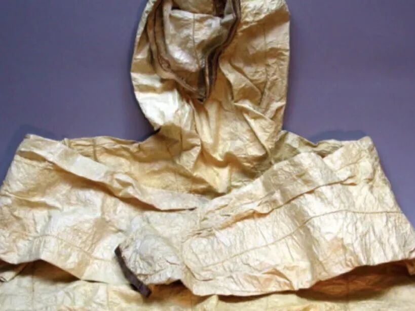 美军对于这件海军雨衣的构想,恰恰符合曾经古代的因纽特人在酷寒的极地捕猎时,对于一件防水防潮的雨衣的设想。或许用海豹和鲸鱼的肠,做出这样一件雨衣,对于很多人来说有些疯狂,甚至于想都不敢想,但是对于因纽特人而言,这属实是稀松又平常。
