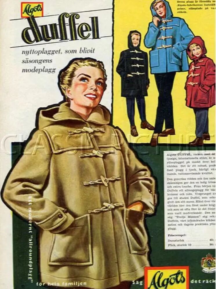 对于DUFFLE COAT的起源,有一部分人认为款式来源自僧侣所穿的兜帽,面料来自于比利时,而另一部分人则认为款式和面料均来自于比利时