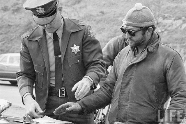 图一为身着N-1甲板服的著名男星李·马文,而图二美国的《LIFE》时代周刊,记录下了在美国加州的一位摩托车俱乐部成员正在接受处罚,而他的身上正穿着N-1
