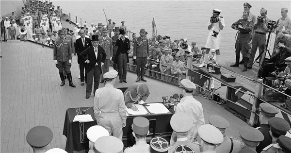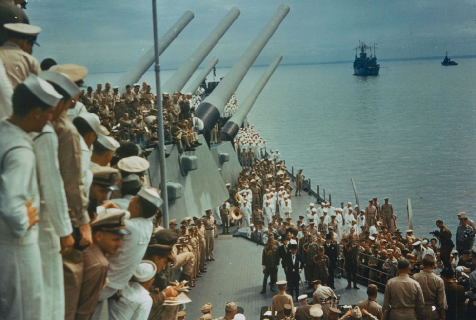 二战后期,美国海军已经超越了英国海军,图二为1945年9月2日,同盟国联合受降典礼于东京湾的美国军舰“密苏里”号上隆重举行。