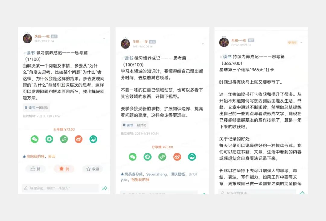 之前不会写作的我,只是把想法放在大脑里面,并不能总结出严谨而有逻辑性的思考,自从在星球里把写作打卡形成习惯之后,刚好弥补了我这方面的不足。