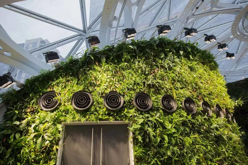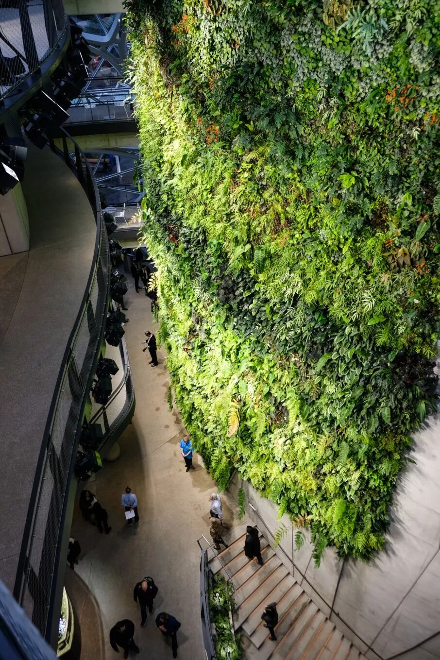 Living Wall 应该是 The Spheres 最大的特色,足有四五层楼高,拥有超过 25000 种植物,被植入 4000 平方英尺的墙内,是生物多样性的创新示范,同时也是亚马逊园艺学家 Ben Eiben 的心血结晶。