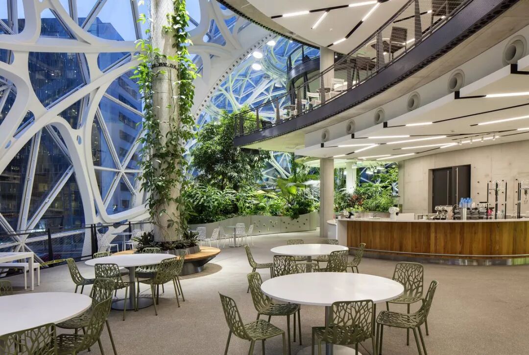 The Spheres 内设有休息区、会议室、工作区、亚马逊职工休息和就餐区域等。而 Amazon Go 距离 The Spheres 仅仅几步之遥。此外,该建筑内的通风系统则模拟户外微风,白天温度保持在华氏 72 度,湿度为 60% ,到了晚上,晚上温度会下降,湿度会上升。