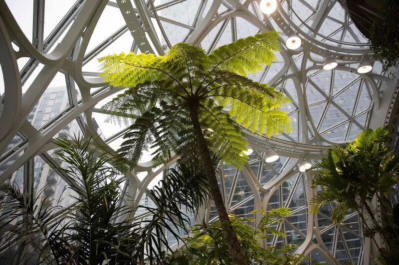 The Spheres 由三个玻璃球状建筑物组成,最大的球体高 90 英尺(约 27 米),宽 130 英尺(约 40 米),里面种植了来自世界各地的植物,多达 4 万多株,覆盖的物种有 400 多种,行走其间犹如漫步林中,可谓一个“室内热带雨林”,而三个玻璃球状建筑物其实是使用钢框架和夹层玻璃建造,每个球体需要 2643 块面板,热量从面板反射出来,但允许适当波长的光通过,以利于植物的生长。