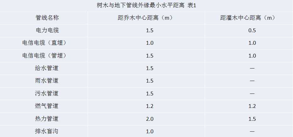 6、苗木与建(构)筑物、管线之间的间距,并满足《城市道路绿化规划与设计规范》;新建道路或经改建后达到规划红线宽度的道路,其绿化树木与地下管线外缘的最小水平距离宜符合表1的规定;行道树绿带下方不得敷设管线。