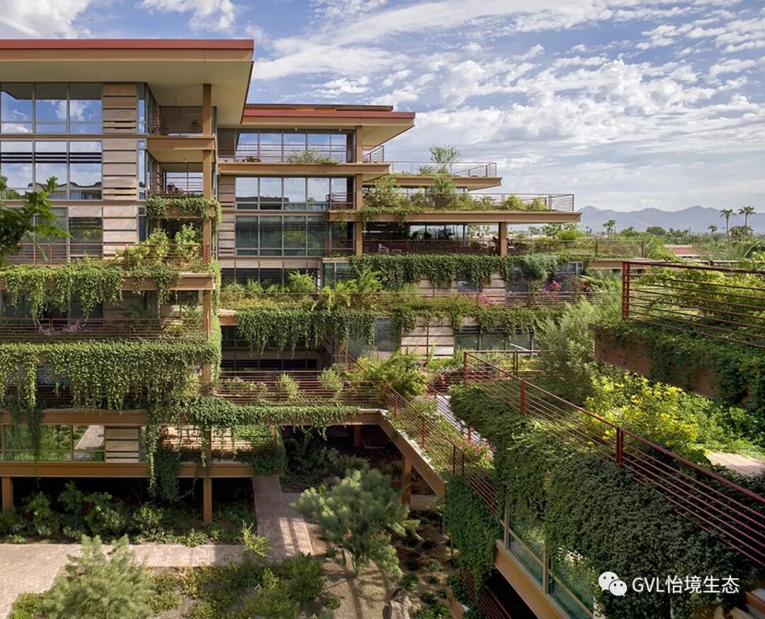 ▲亚利桑那州垂直绿洲:Optima是首个在干旱环境中采用大面积和浅层绿色屋顶系统的项目,高架平台上的蔓生植物营造出层层叠叠的观感,让原本宽阔而开放的建筑群看上去更具亲切感。在维持葱郁外观的同时,Optima项目也实现了高度的可持续性,获得了包括LEED黄金级认证在内的多项环保认证。