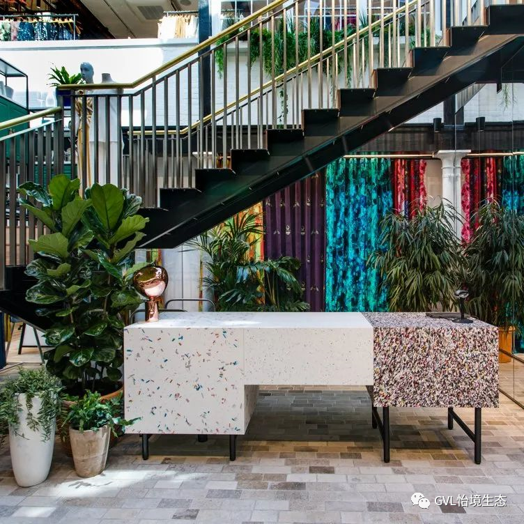 ▲Smile Plastics塑料再生板:原材料有酸奶瓶、塑料包装、回收家电等各种消费后和工业生产中回收的塑料,通过Smile Plastics这家公司的特殊加工工艺,把它们压制而成的实心面板。