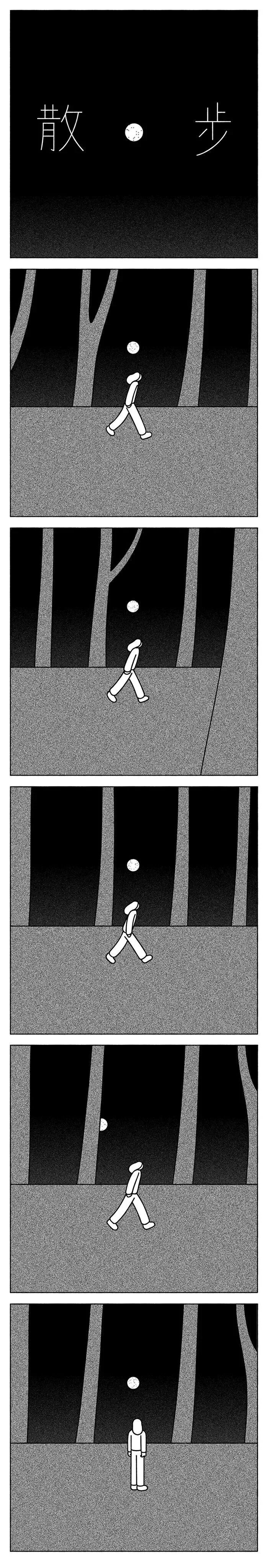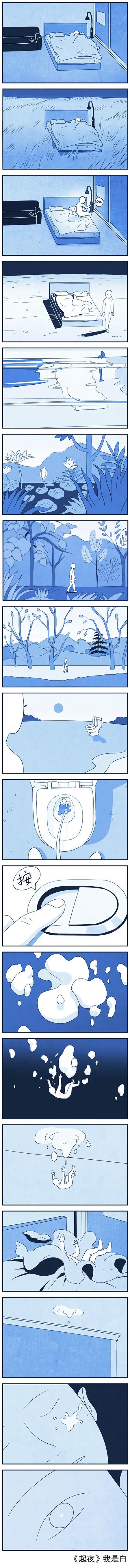 于是,便有了他的第一幅真正意义上的漫画——《起夜》。这个处女作,也完全展现了我是白的特点: