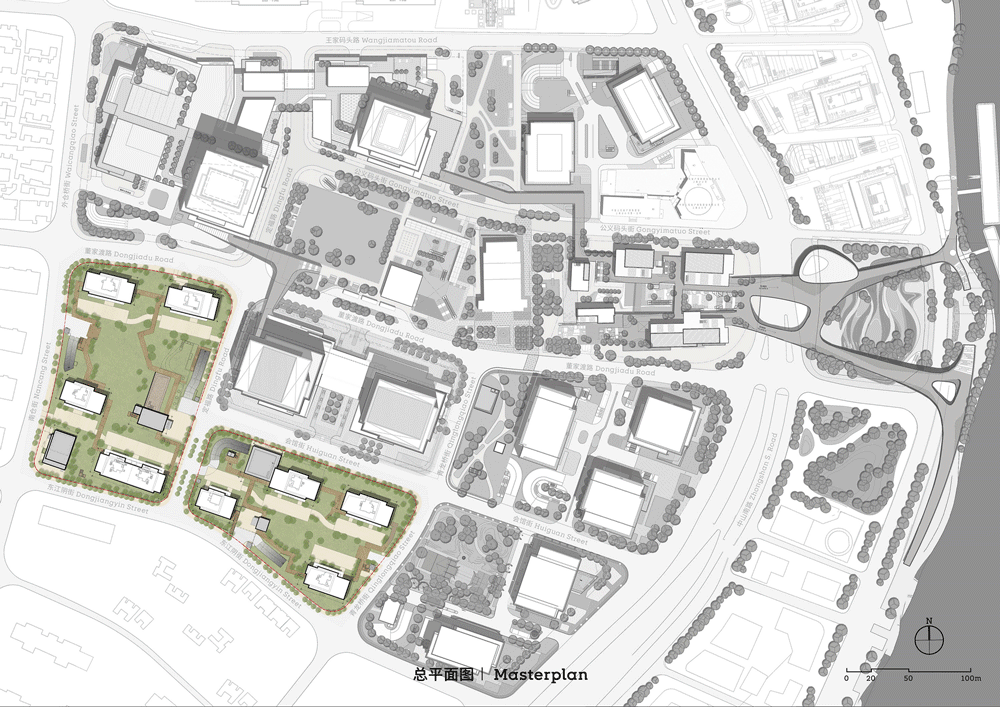 “S”形楼栋的排布有利于在2个地块分别围合出独立的景观核心,提升公共空间的流动性,也营造出一条贯达黄浦江的视觉通廊,链接城市视觉场域。面对片区内的老建筑商船会馆,布局中叠入隐藏的轴线,通过多层次的空间序列,创造新老建筑“比邻而居,相望而不相离”的对话姿态。