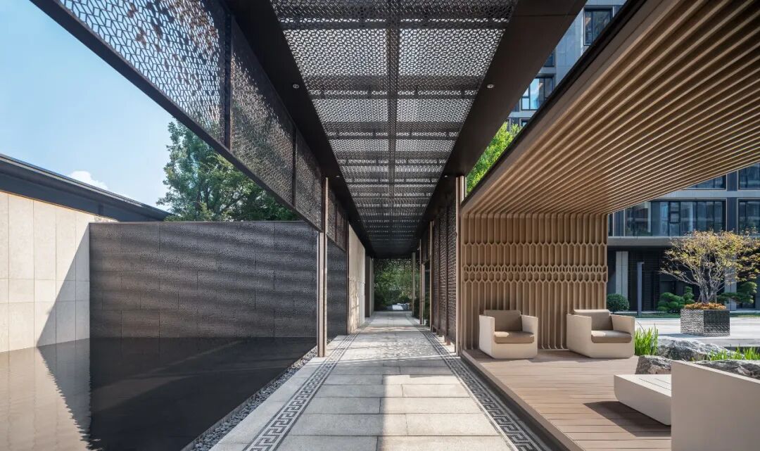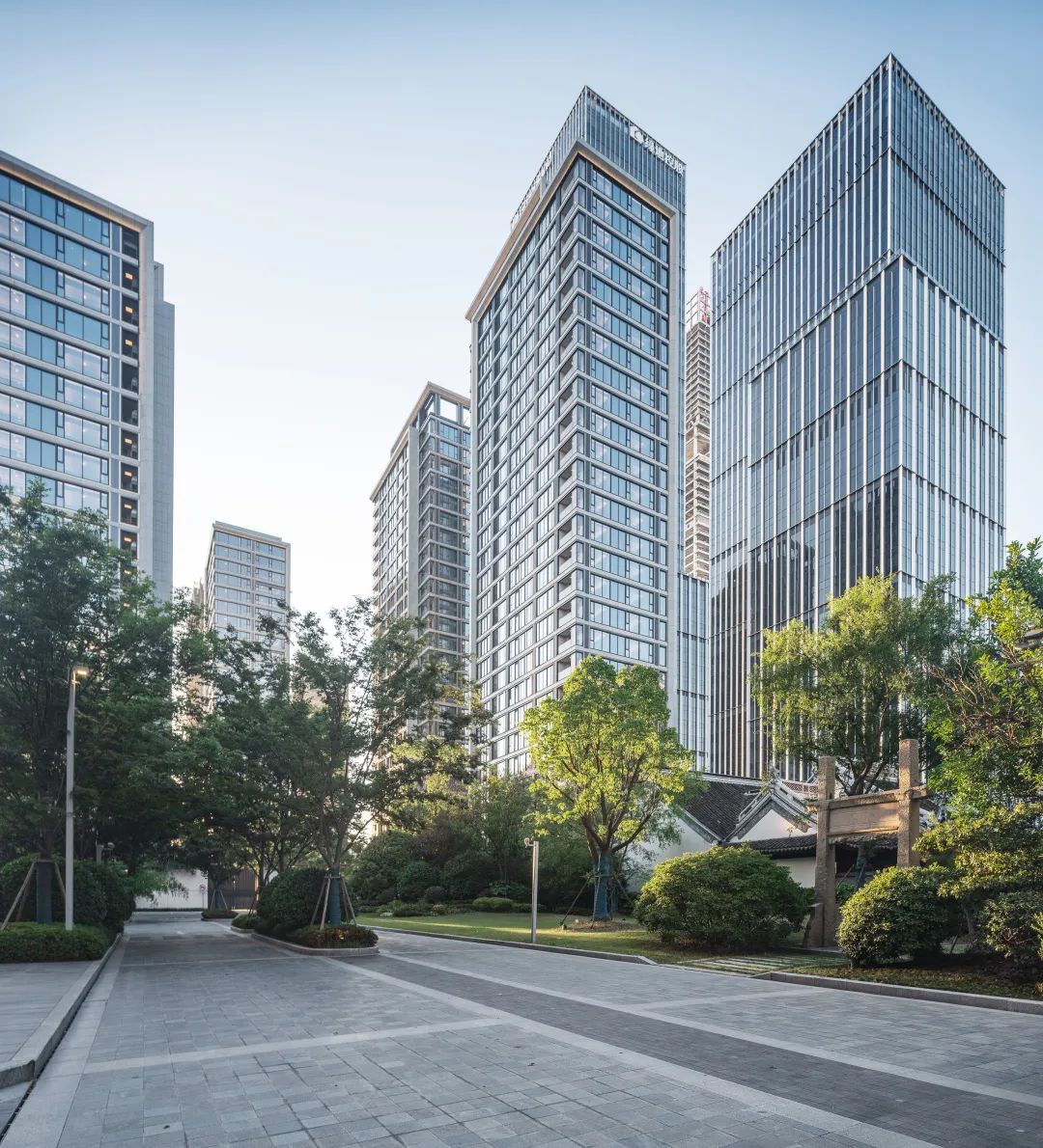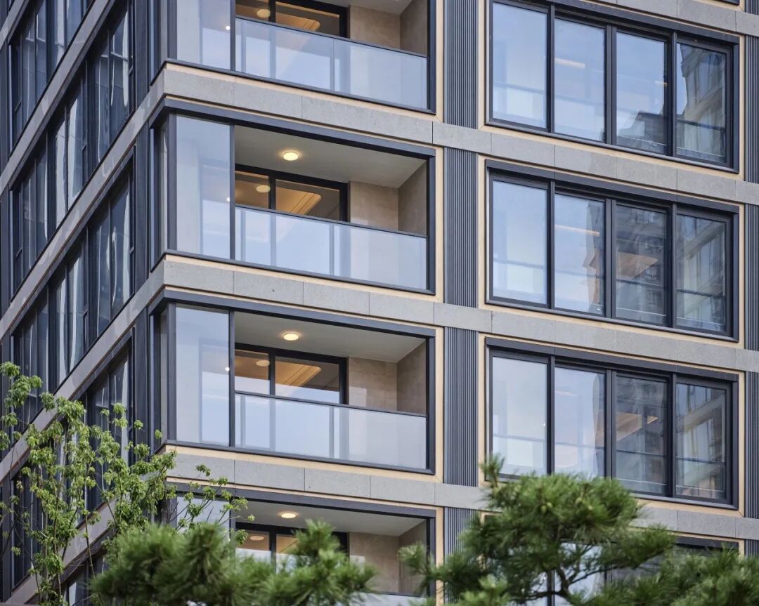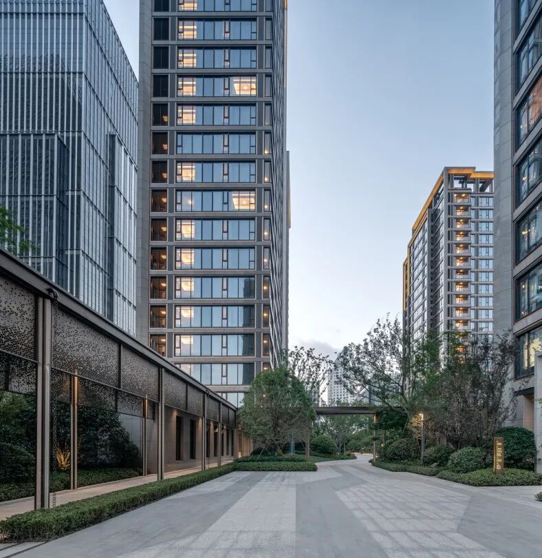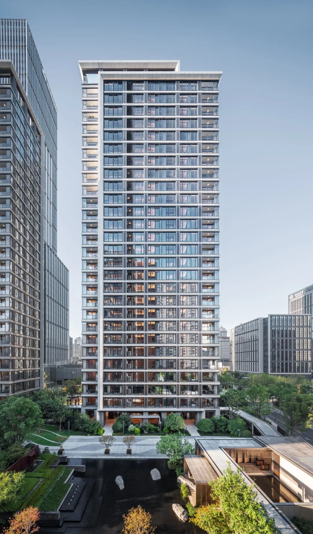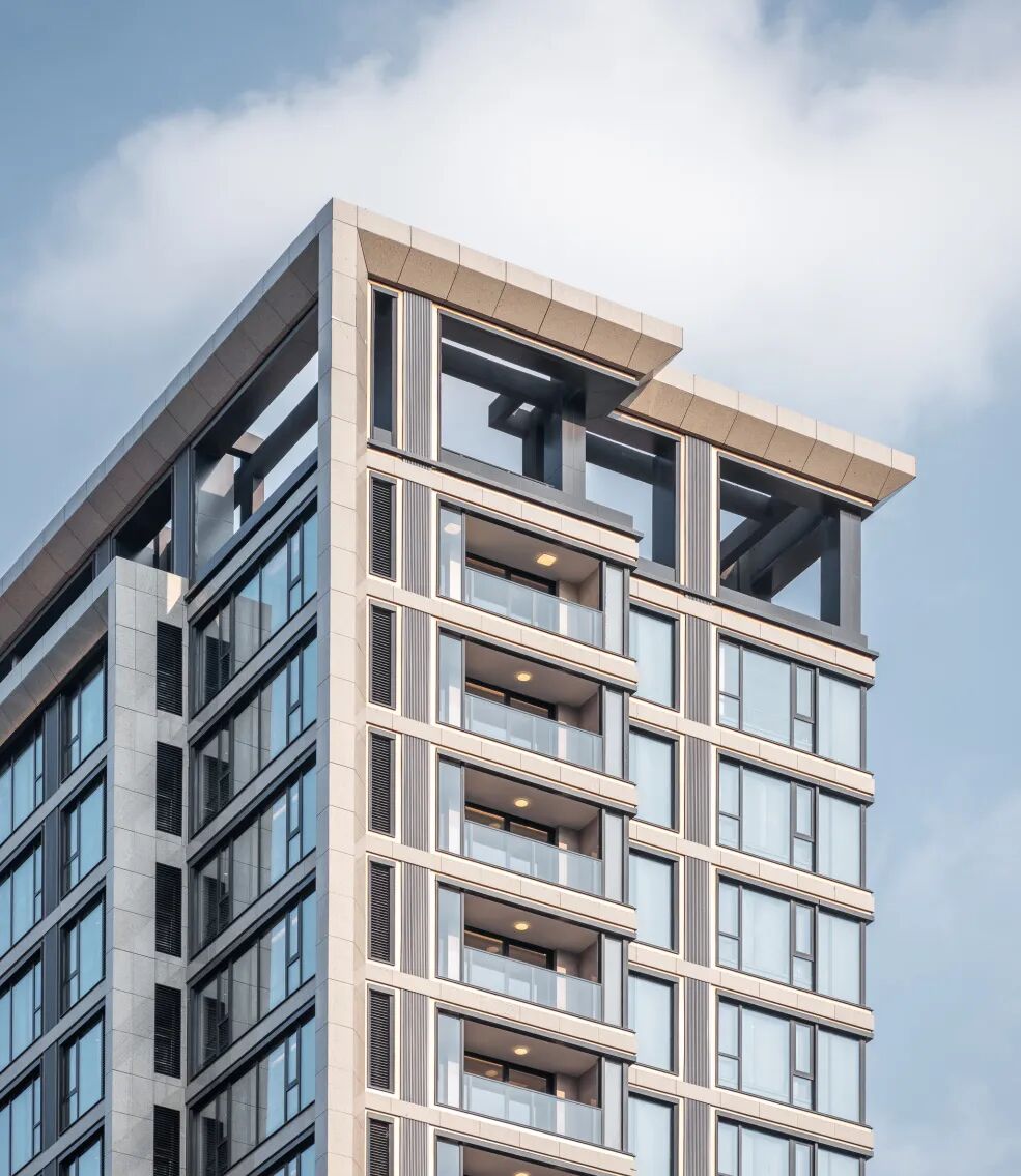 立面线条与颜色为建筑营造低调内敛的气质。边框笔挺的线条由石材与不锈钢材制成。石材由常规斜切的截面形态削减成“U”形,达到视觉减距的效果,提升立面的精致感。由工艺精良的镀钛不锈钢材勾勒出的金色线条是立面的点睛之笔,既彰显出建筑的现代质感,也传递出温暖柔和的居住氛围。