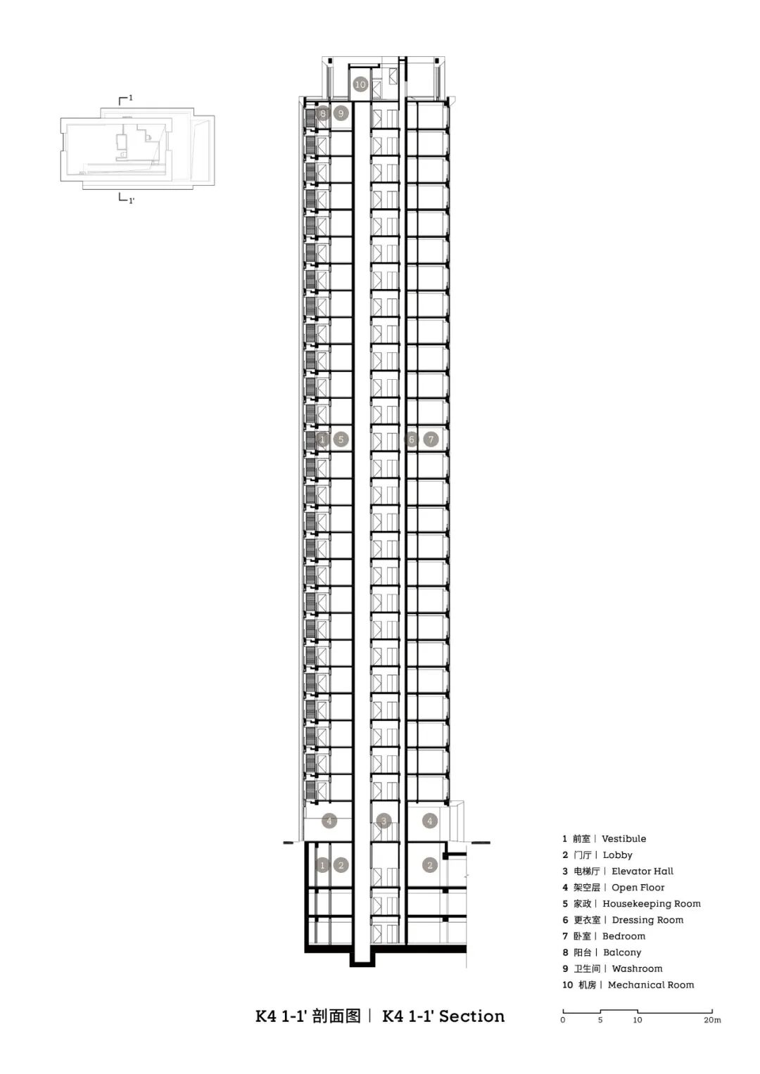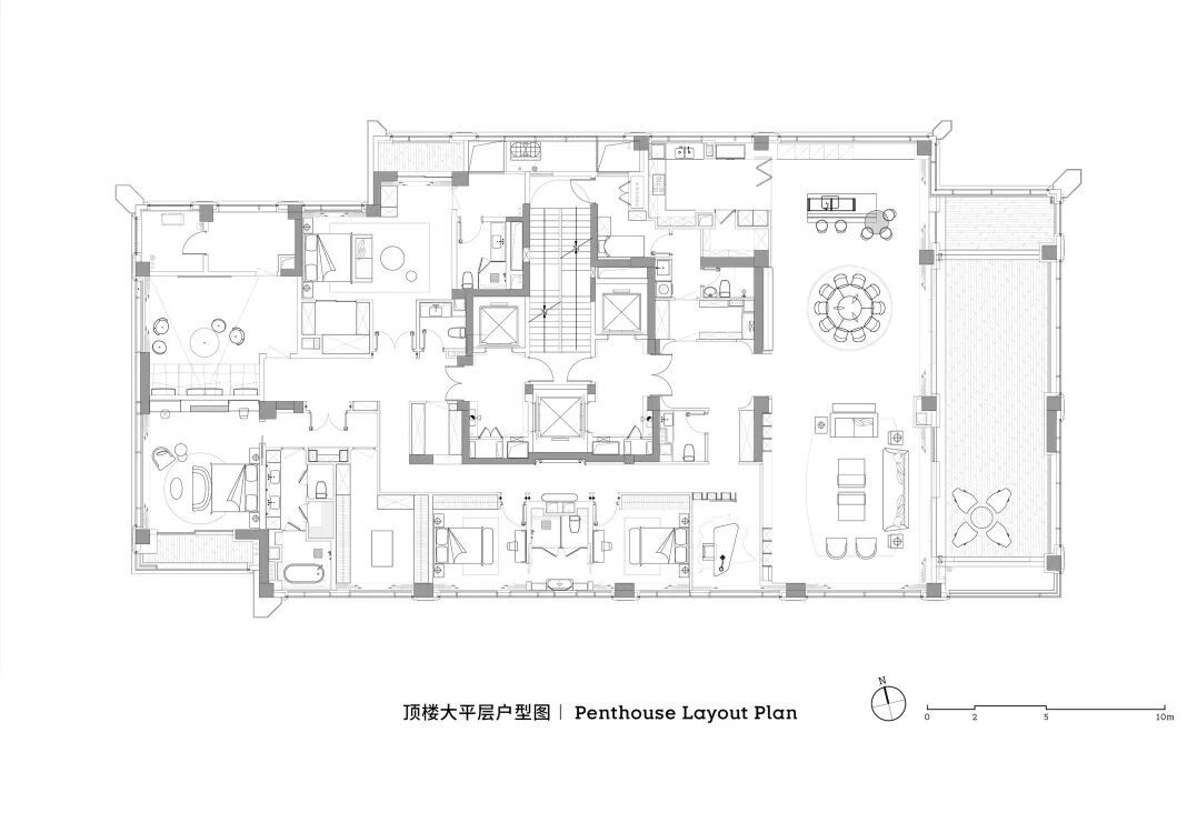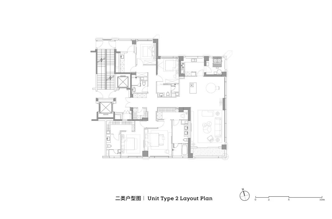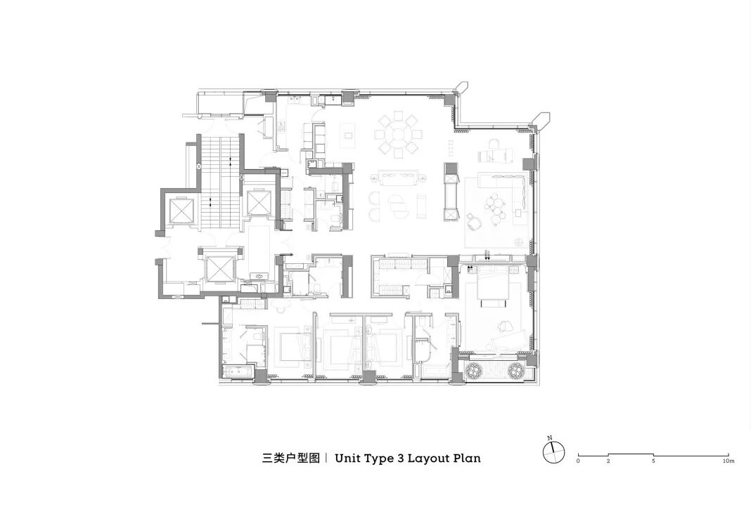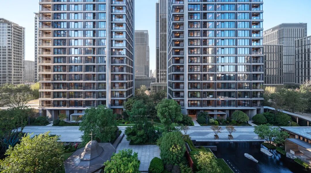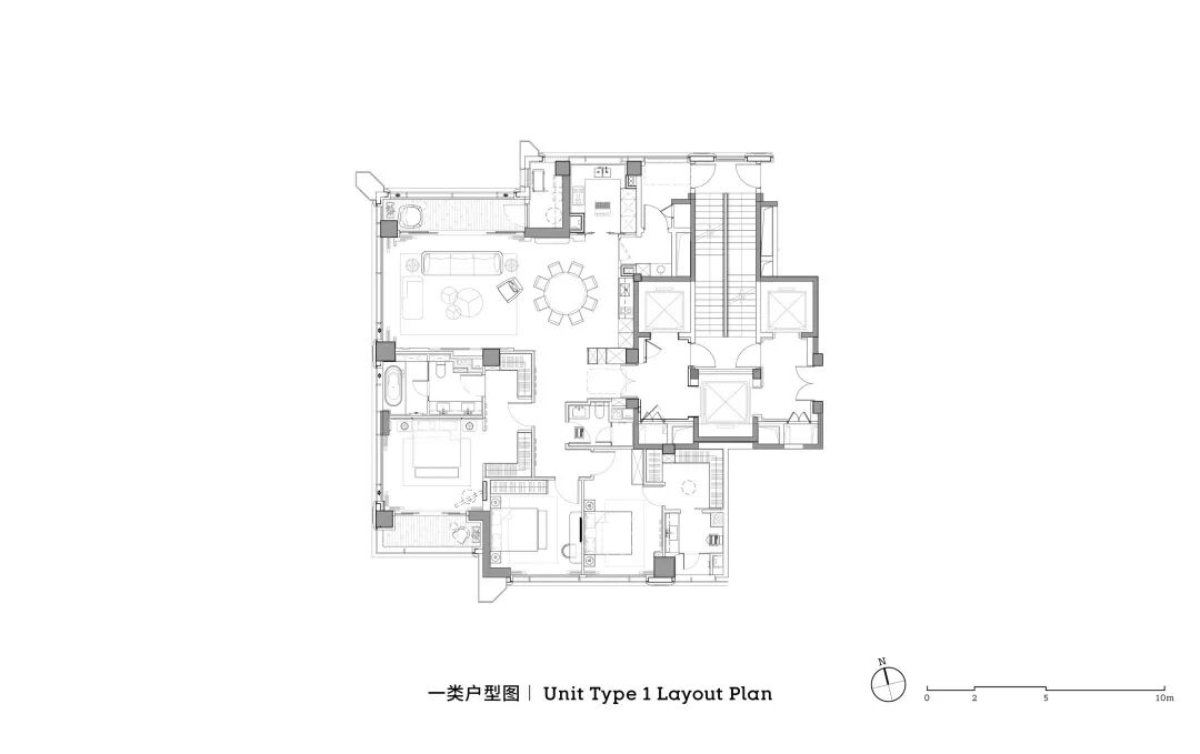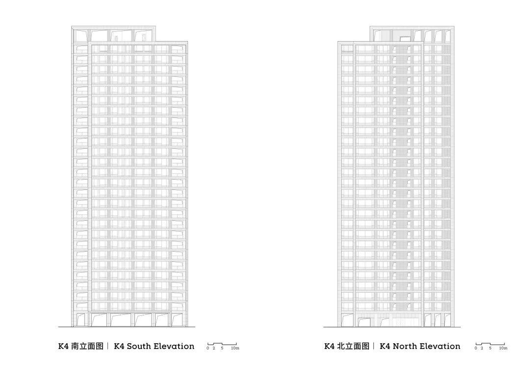 立面线条与颜色为建筑营造低调内敛的气质。边框笔挺的线条由石材与不锈钢材制成。石材由常规斜切的截面形态削减成“U”形,达到视觉减距的效果,提升立面的精致感。由工艺精良的镀钛不锈钢材勾勒出的金色线条是立面的点睛之笔,既彰显出建筑的现代质感,也传递出温暖柔和的居住氛围。