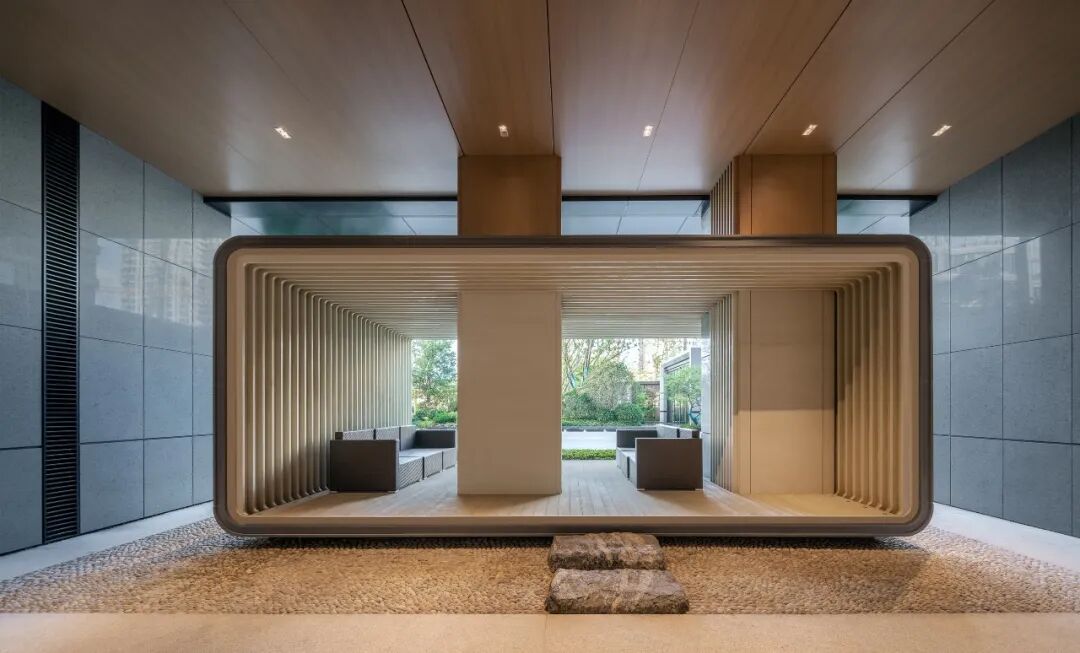 深度定制化产品和精细化设计是海珀外滩重要设计策略之一,设计团队对于尺度的细致推敲和毫米级的材料研究带给居住者更为细腻的入户体验。建筑师在离地30、80、100米的不同高度模拟了可能的视野情况,确保户型产品视野最大化;入口场地的空间从人的感受出发,对行车轨迹进行模拟,确定最舒适合理的落客空间尺寸。
