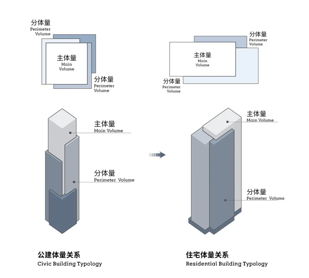 在整体视觉协调统一的基础上,海珀外滩仍保有其独特性。为了加强虚实对比,建筑采用“打框”的设计手法,强化边界的转折;通过主次体量之间的叠套与穿插,增强视觉的丰富性;在视觉通廊两侧的楼栋屋顶采用叠落和冠部微调的处理,让高度相近的塔楼仍具层次感。