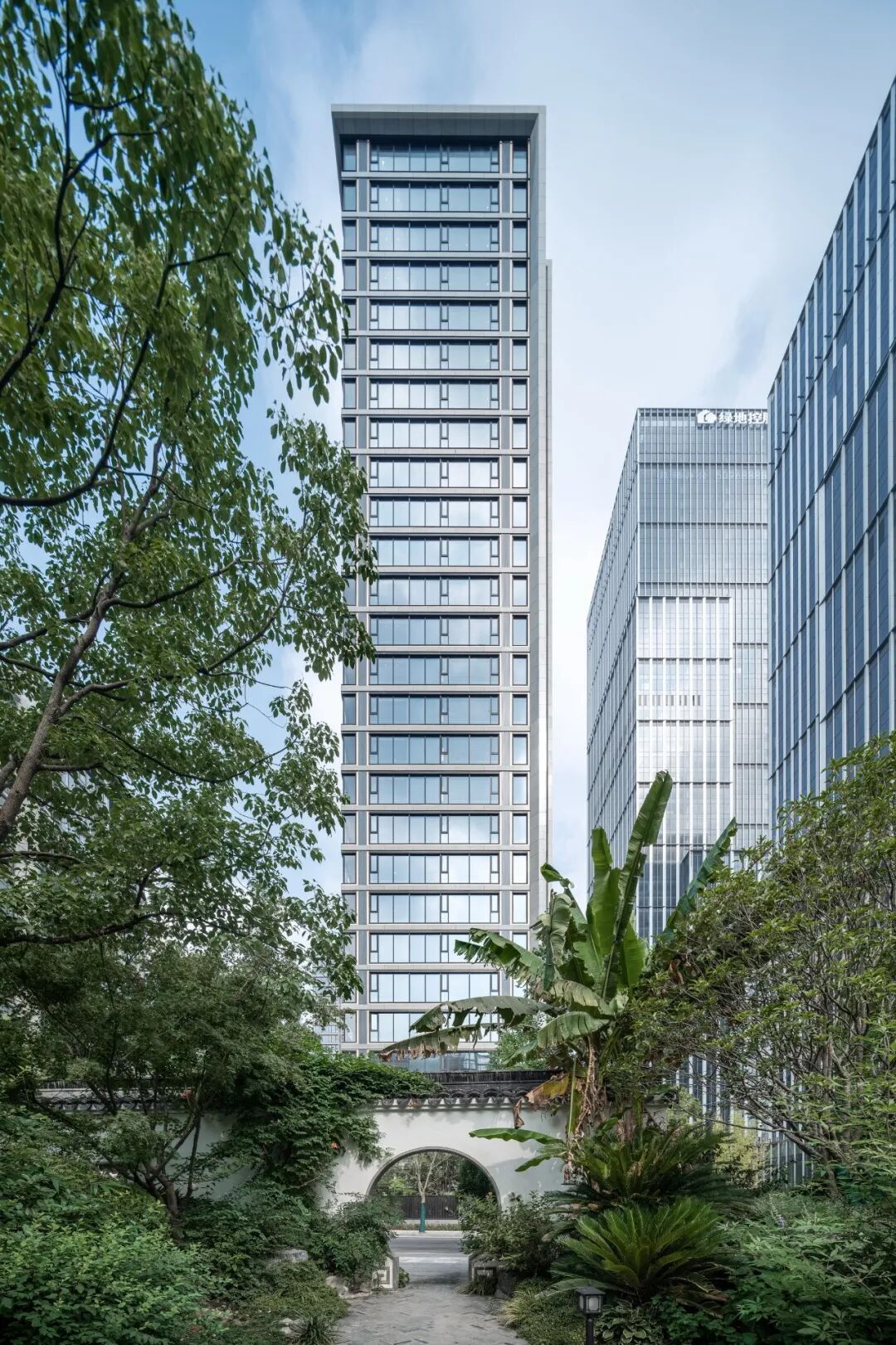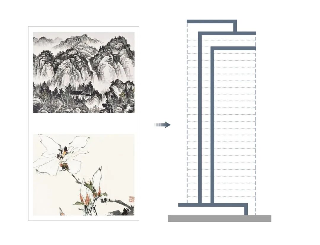 在形式语言处理上,建筑师选择温和克制地创新,与周围建筑相呼应,有机融入城市环境。设计采用与绿地外滩中心超高层办公楼一致的包裹结构:附着于中心体块的外表皮层层褪去,高层体量被分解为多样的层次。