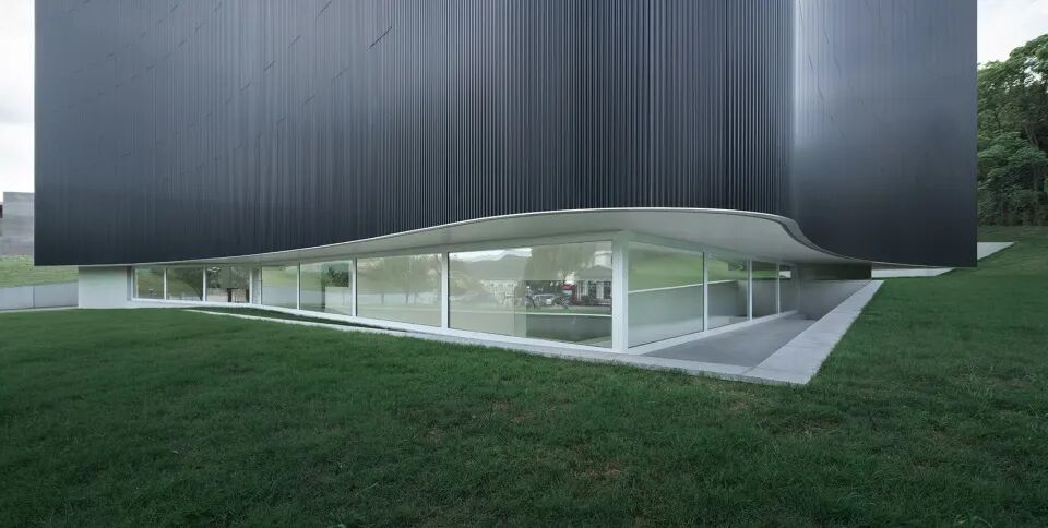 整体的平面形态在朝山一侧以多端曲线展开,朝街道一侧为连续的自然曲线,且向外凸出。黑色的双层波纹铝板包裹了大部分的体量,赋予了建筑强烈的雕塑感和重量感;同时,整体的悬挑设计又使上部体量漂浮在倾斜的场地上。