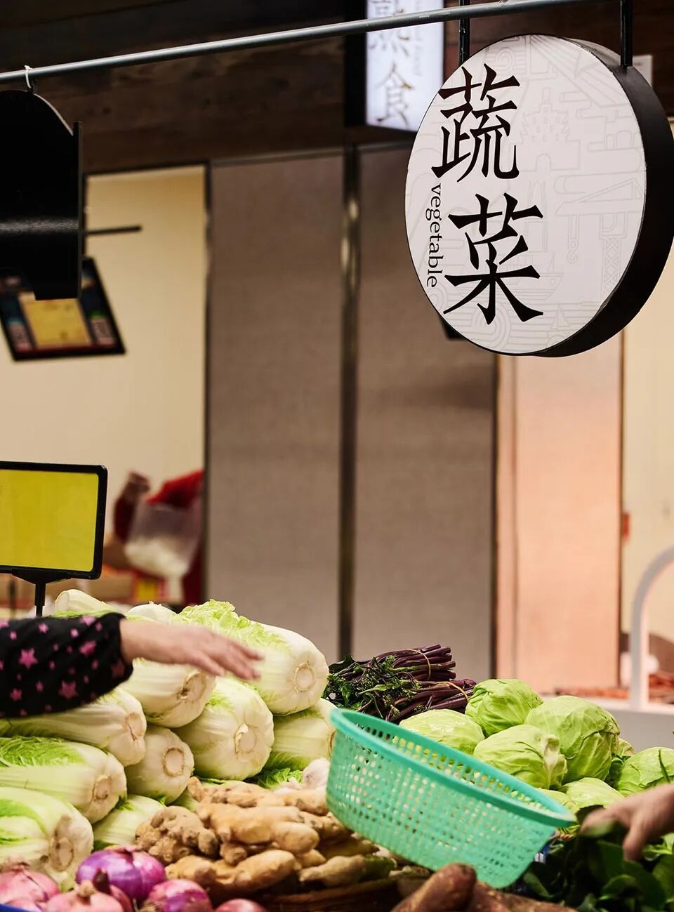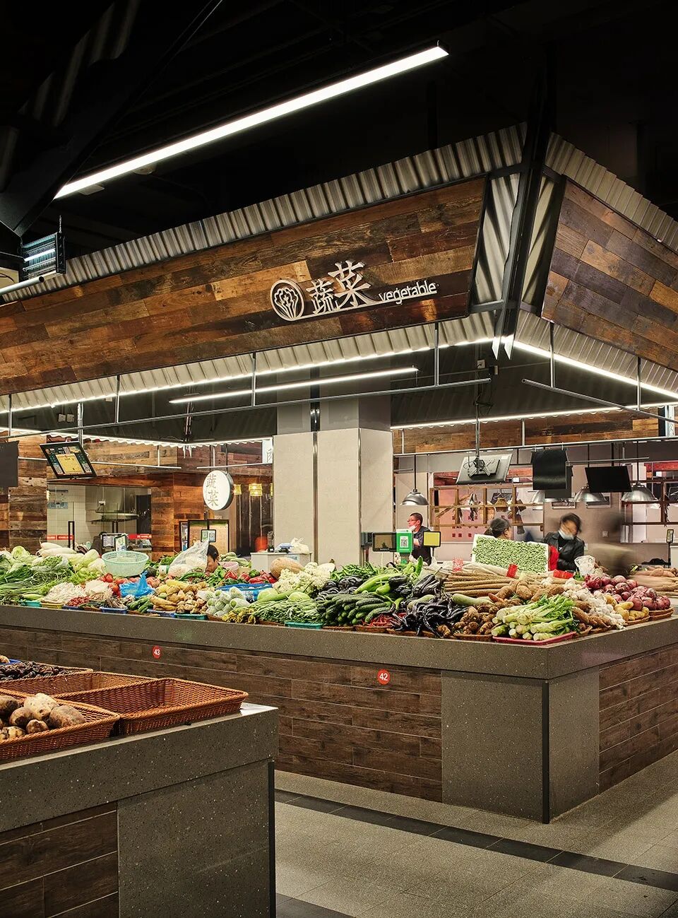 在改造中,福明菜场定位在菜市场里的宁波美食博物馆,成为代表宁波的美食地标名片。设计从“福”100+存在形式的字符里获得了直接的装饰图案灵感和气氛营造点,运用传统文化中“四水归堂”的建筑表现手法,引用宁波天一阁“天一生水”的理念,承载“天人合一”的理学思想,在江南的文化里,寓意着天财纳福。