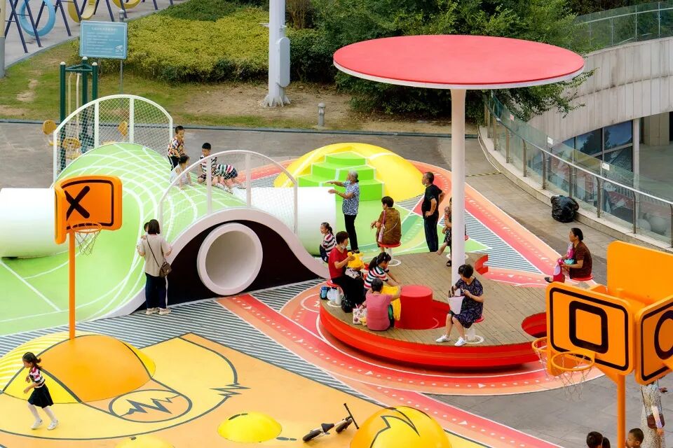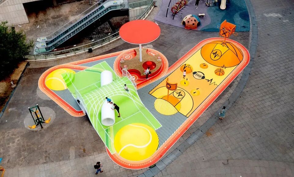 这些超现实的运动场通过跑道连接在一起,为孩子们提供玩耍的机会,以及通过在创新的“咬合”木板上提供休息的机会,成为公共家具以及成人和其他社会团体的聚会点,通过装置促进社交互动。