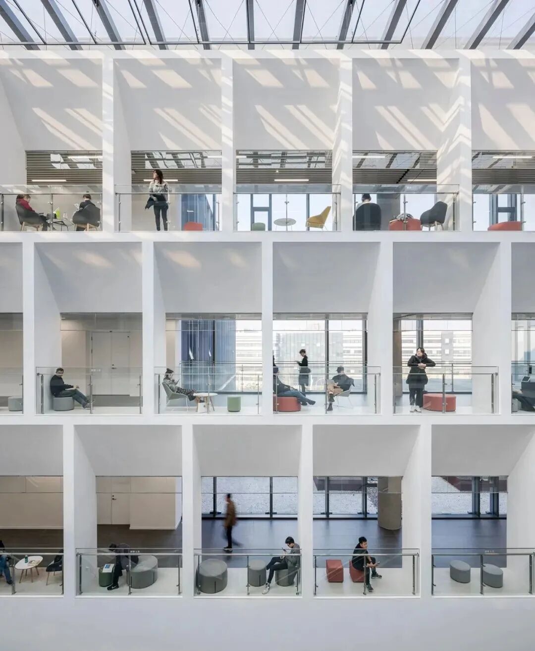 中央是一个五层通高的大中庭,28 米高的“中央公共大书架”,将首层的文化市集,与上层一系列更为安静的专业研究空间和古籍地方文献阅览室联系起来。所有室内空间的自然采光都通过建筑设计进行优化,中央中庭则最大限度地利用自然通风。