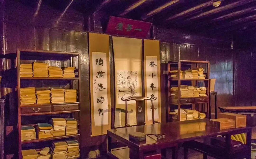 建成于明嘉靖年(1561年-1566 年)的天一阁,为明兵部右侍郎范钦藏书处,是我国现存最早的私家藏书楼。取《周易》郑康成注“天一生水,地六成之 ”之说,以水制火之意,建筑藏书楼。宁波的城市标语:港通天下,书藏古今;后半句指的就是天一阁。