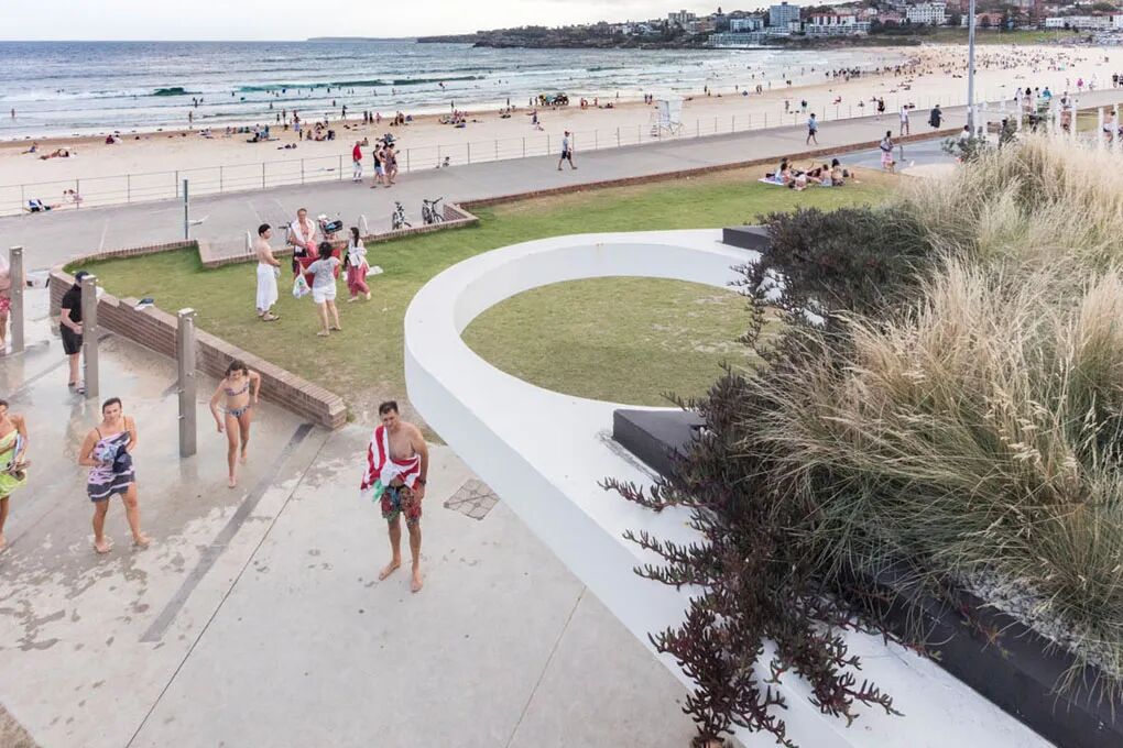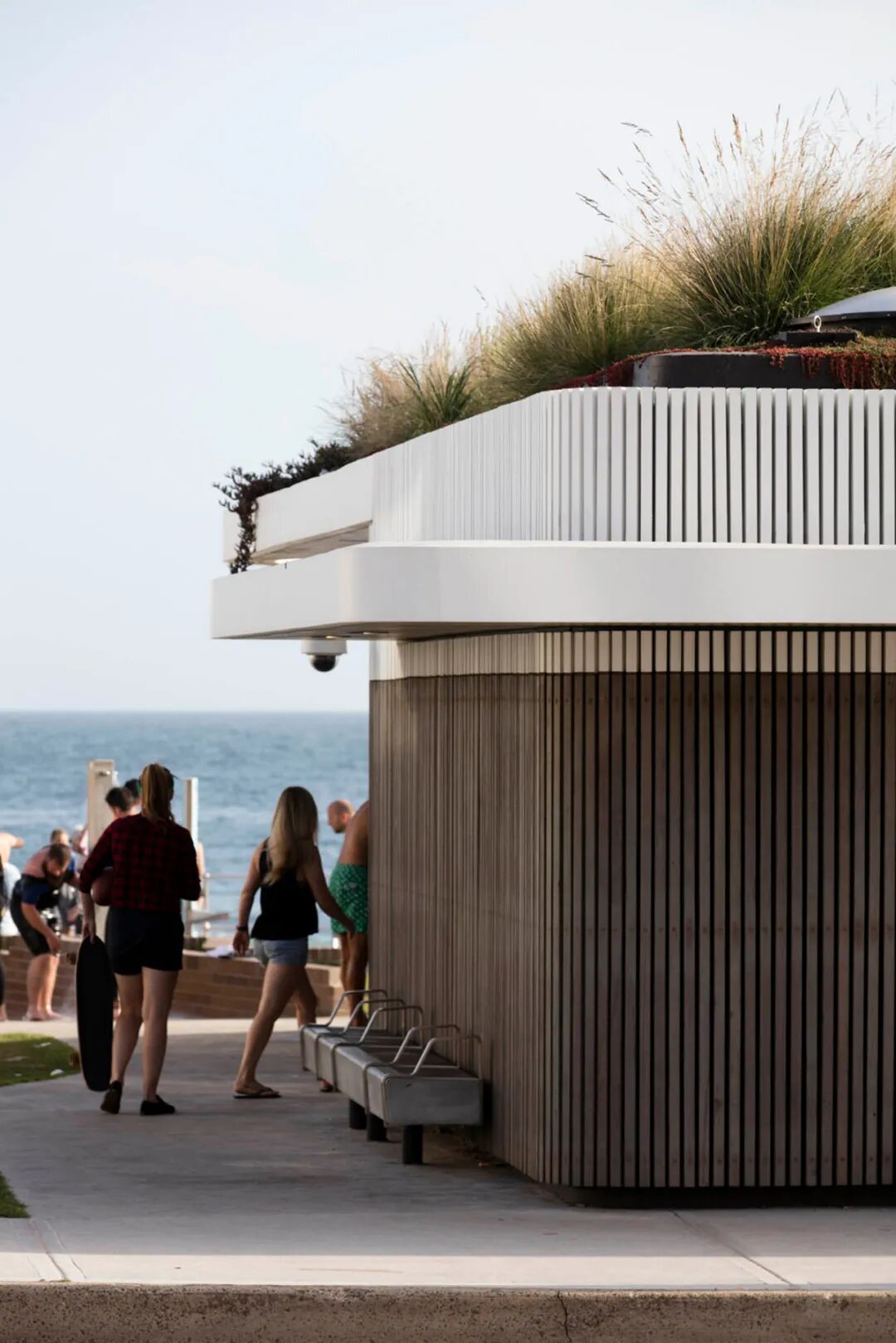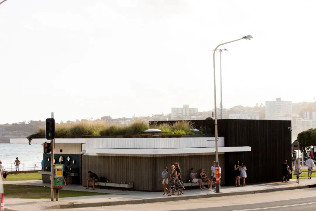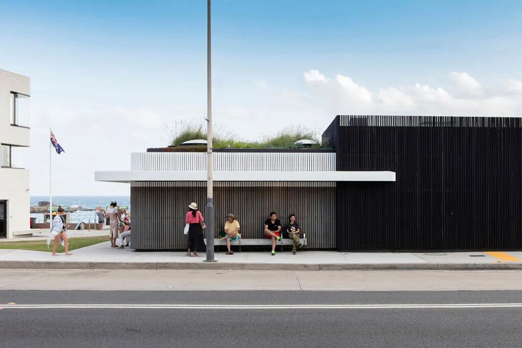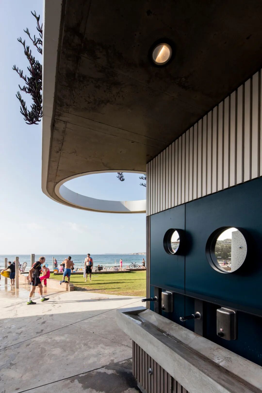 长椅和遮阳篷为 Campbell Parade 巴士站提供了缓解,公共浇铸混凝土洗手盆和室外淋浴将建筑物的舒适性延伸到公共领域。