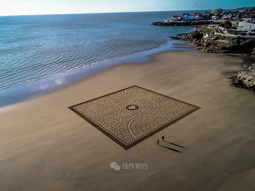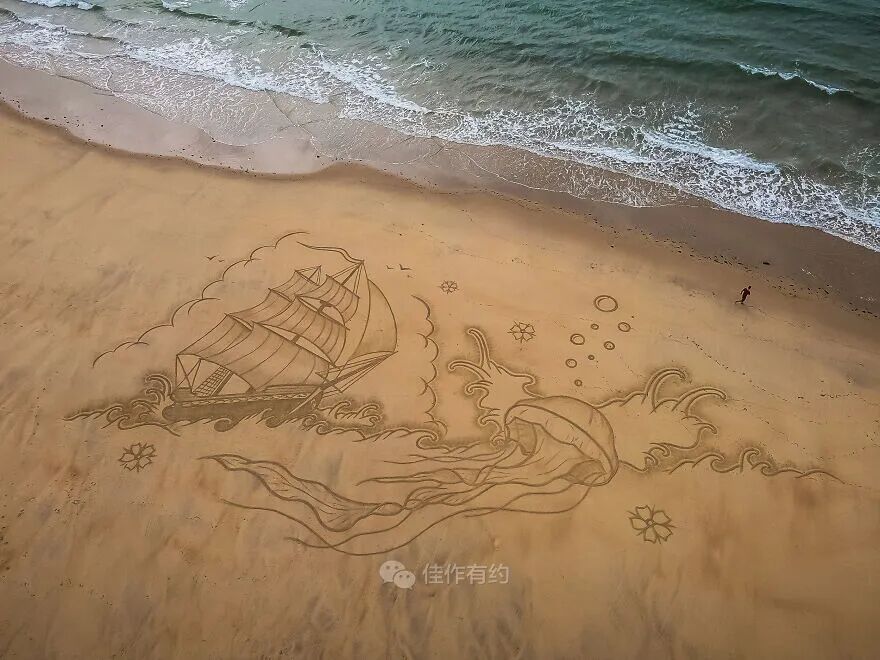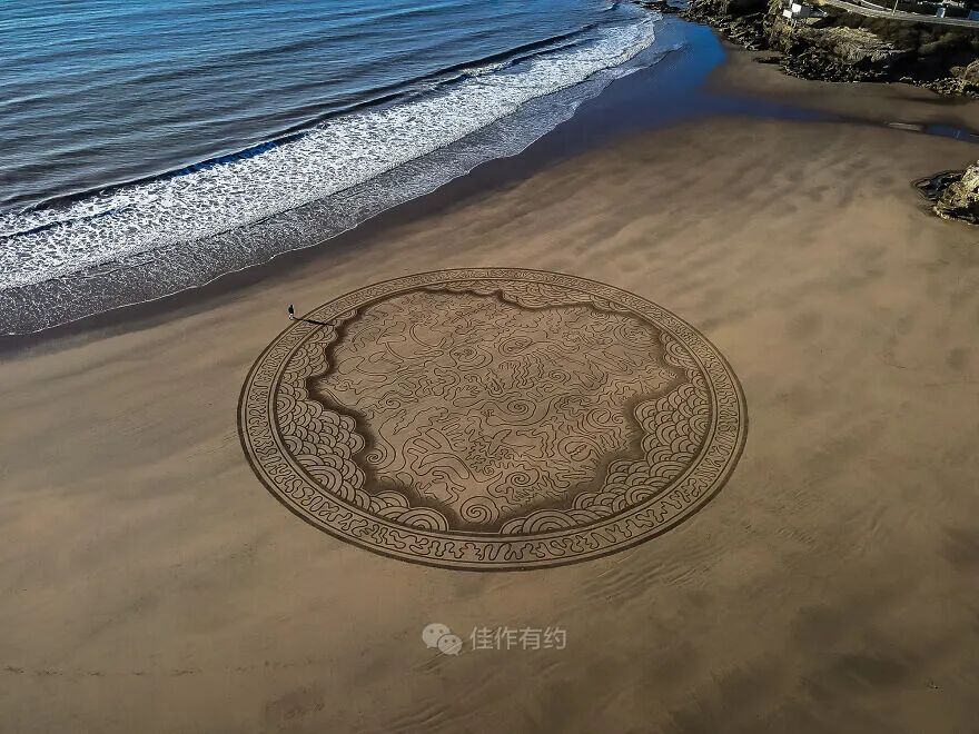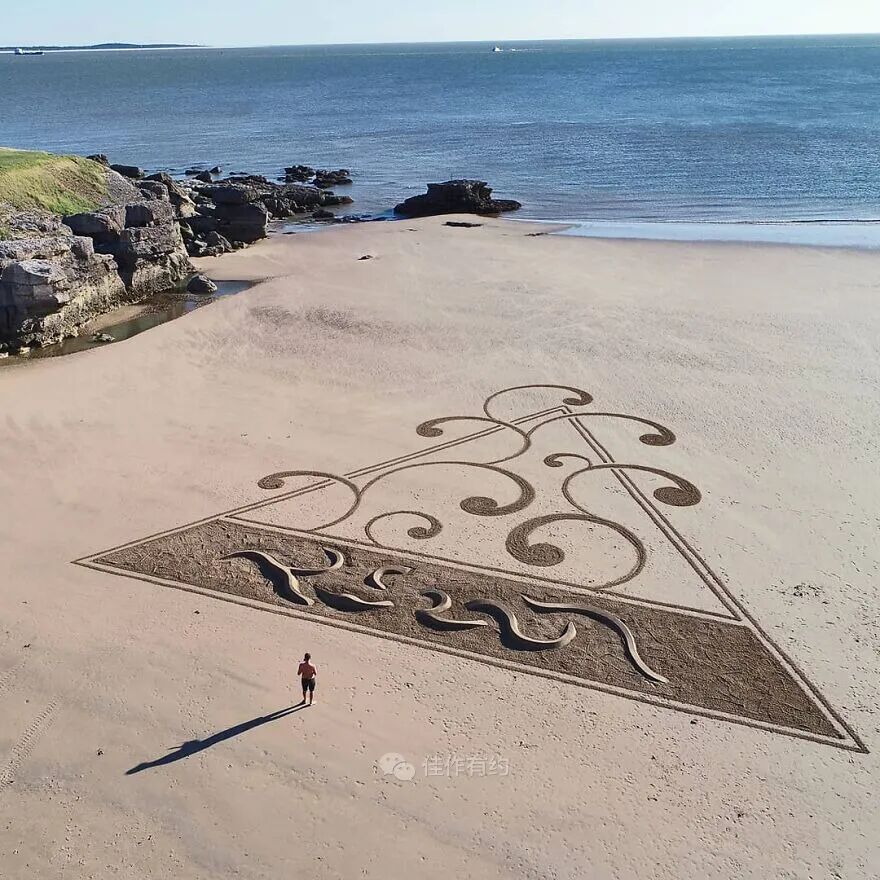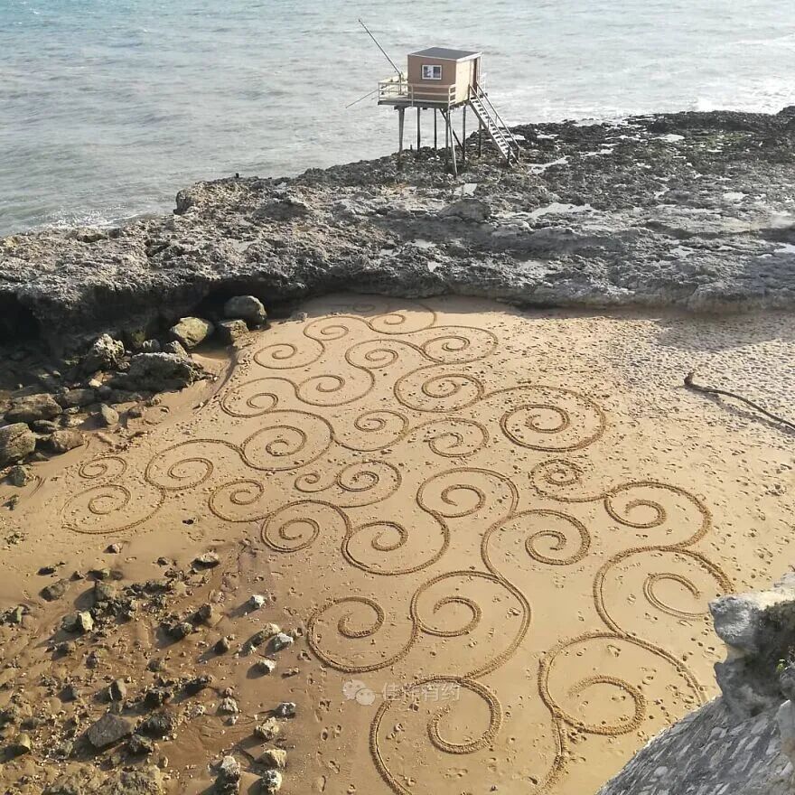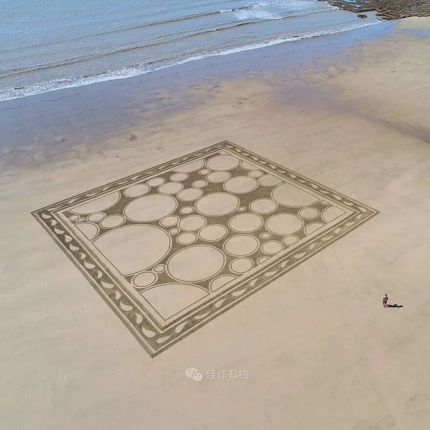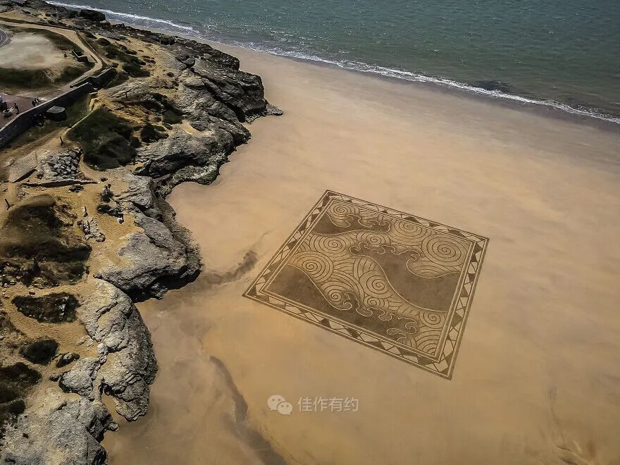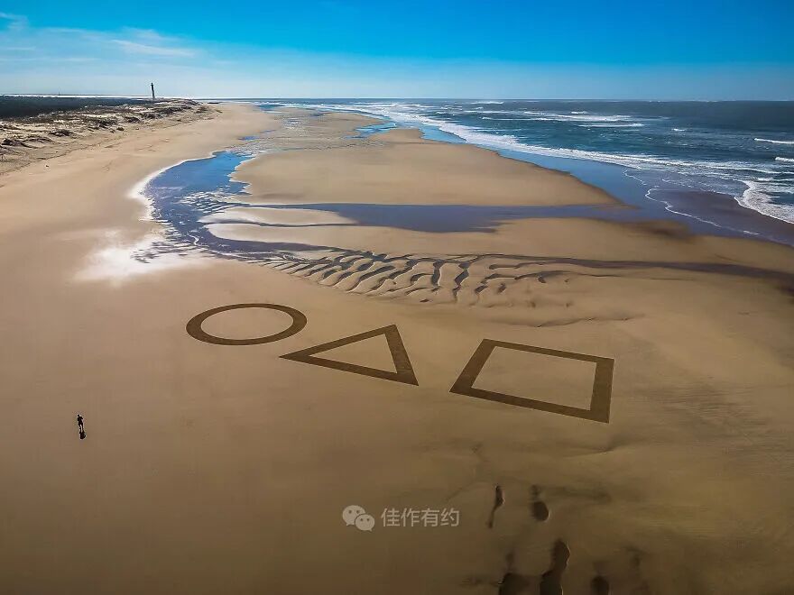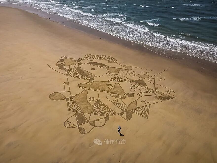 艺术总是无处不在,来自法国的艺术家Jben自2013年以来,一直在位于法国西海岸的鲁瓦扬的海滩上绘画。虽然他的作品只能保存4个小时,但这并影响他的创作,相反这更加激发了他的创作热情。艺术家Jben用无人机拍摄艺术作品,他的作品一般在 30 到 100 米之间,具体取决于复杂性和潮汐。他从来不用草稿,而是灵感来之后即兴创作,多年来在海滩上绘画成了他的全职工作。