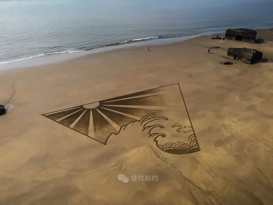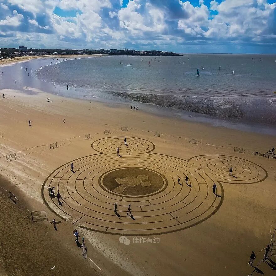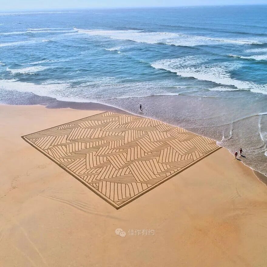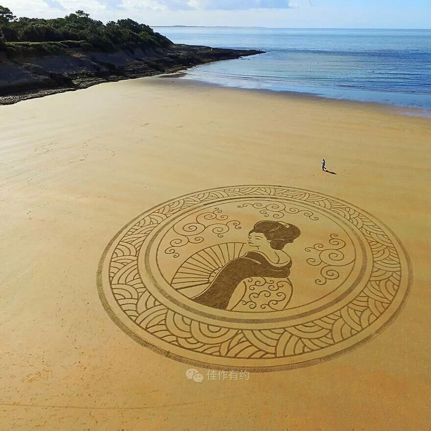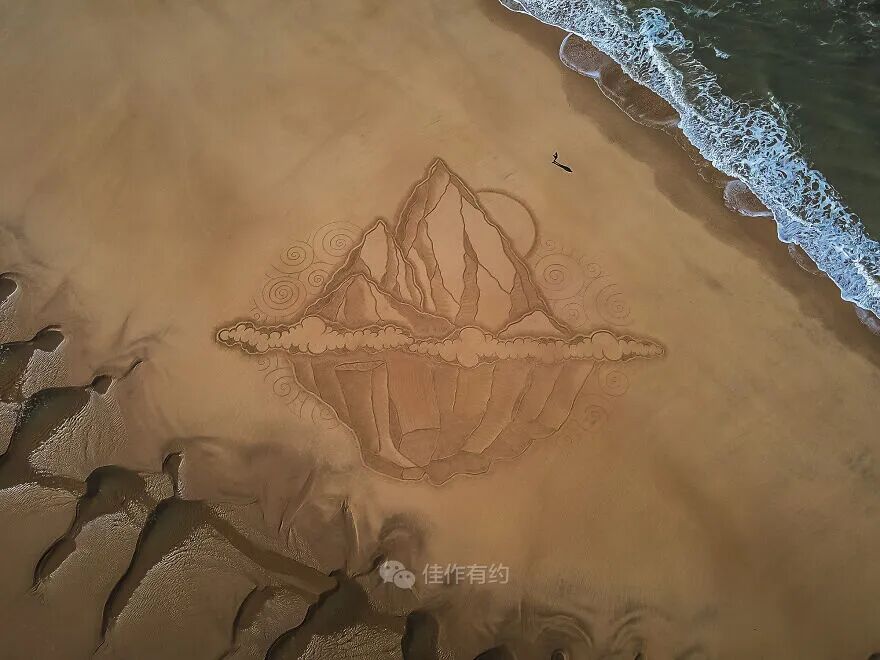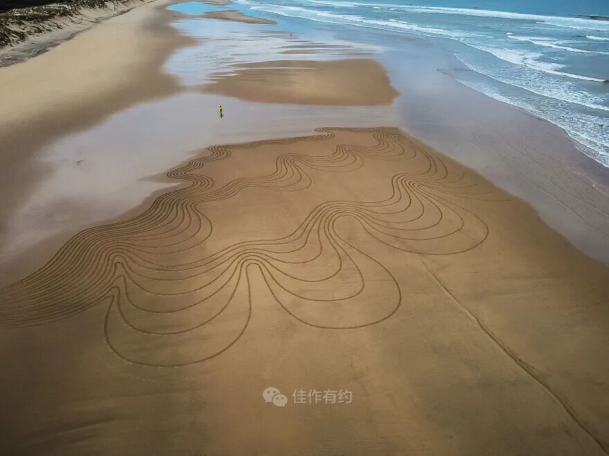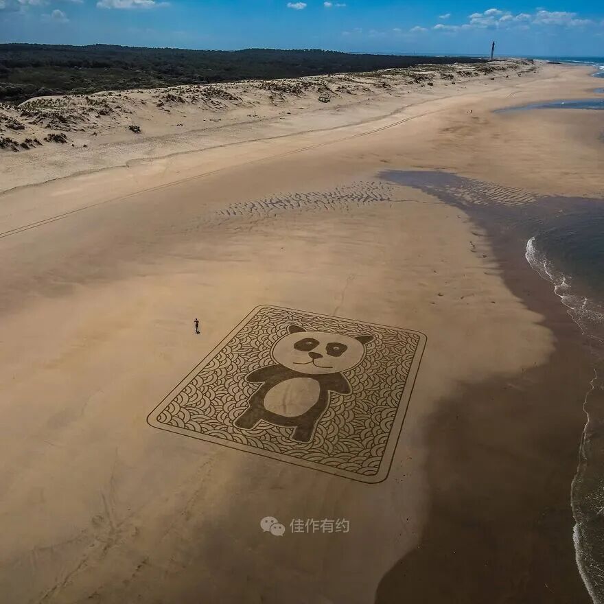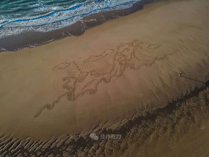 艺术总是无处不在,来自法国的艺术家Jben自2013年以来,一直在位于法国西海岸的鲁瓦扬的海滩上绘画。虽然他的作品只能保存4个小时,但这并影响他的创作,相反这更加激发了他的创作热情。艺术家Jben用无人机拍摄艺术作品,他的作品一般在 30 到 100 米之间,具体取决于复杂性和潮汐。他从来不用草稿,而是灵感来之后即兴创作,多年来在海滩上绘画成了他的全职工作。