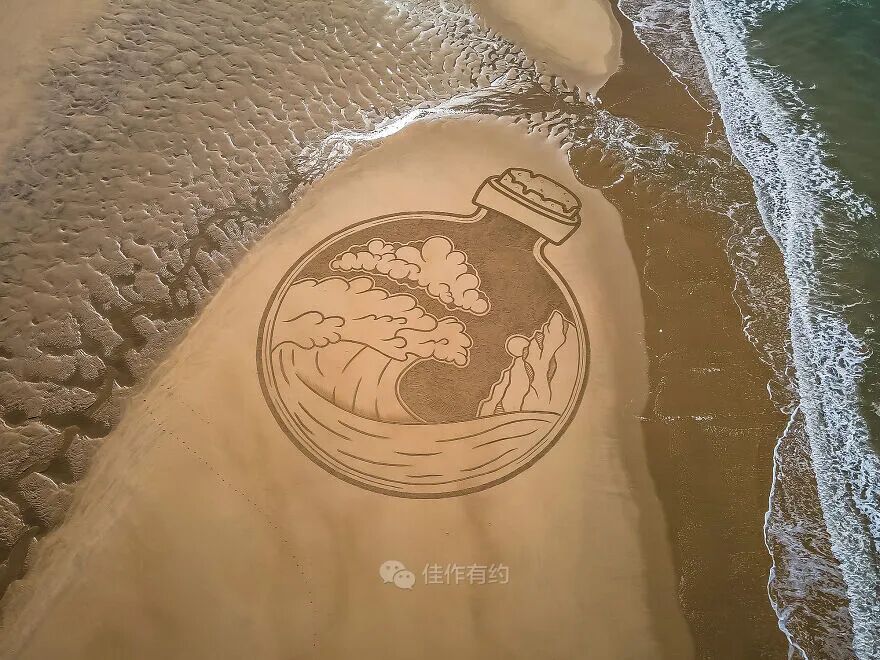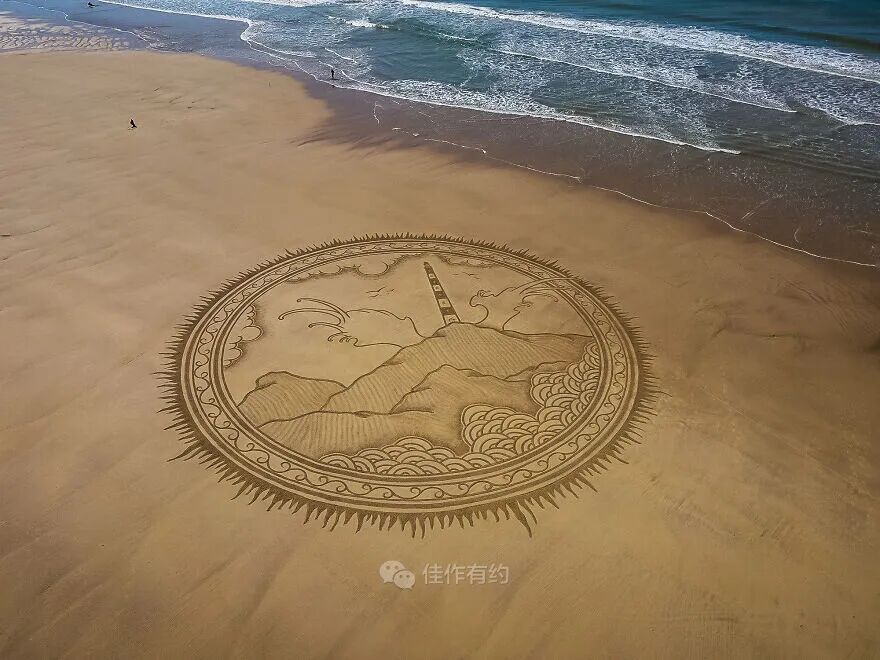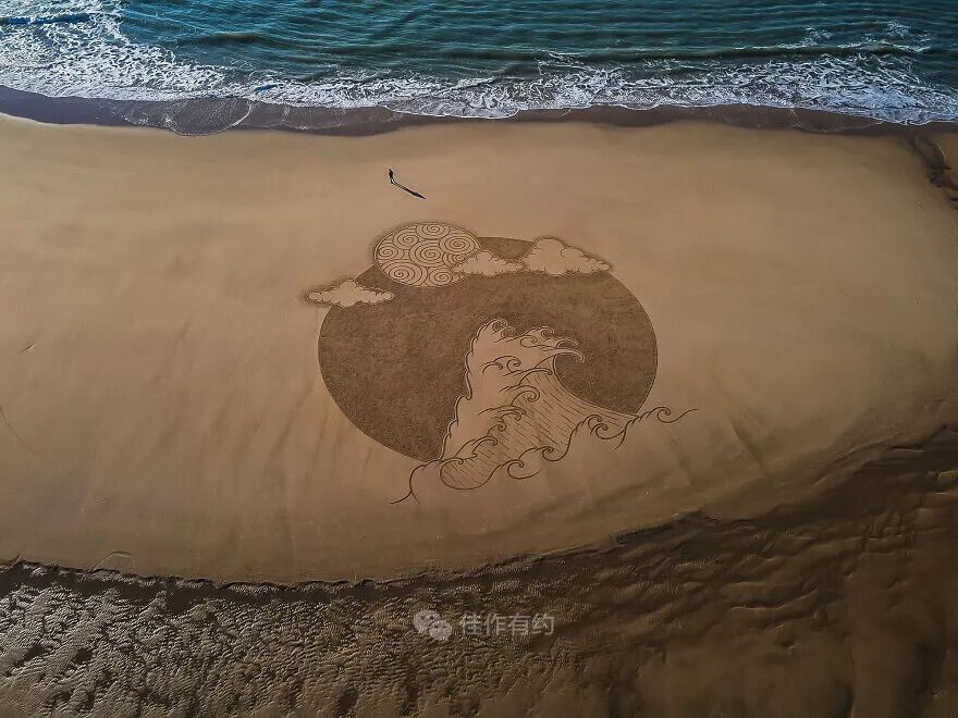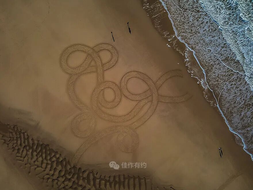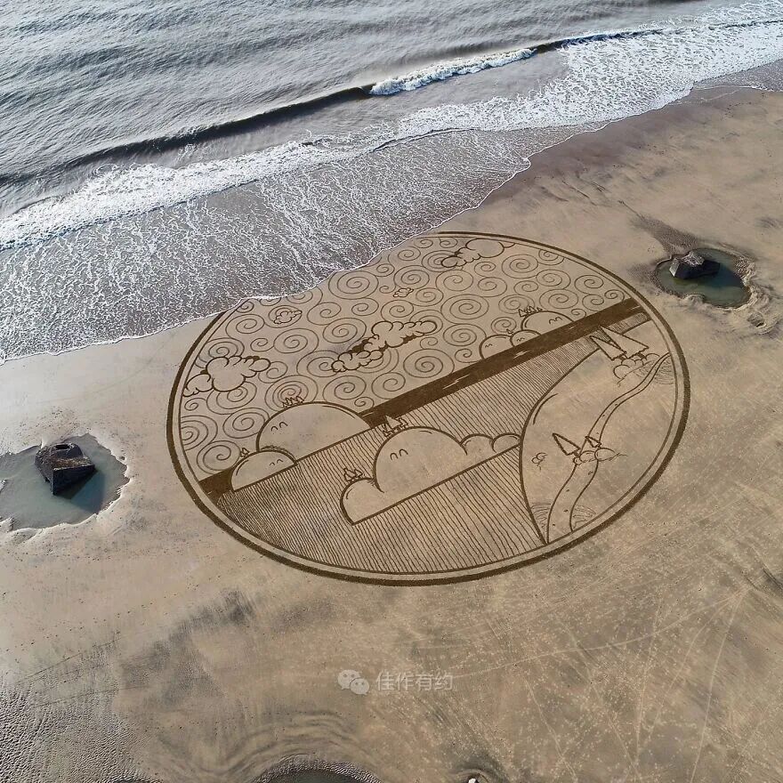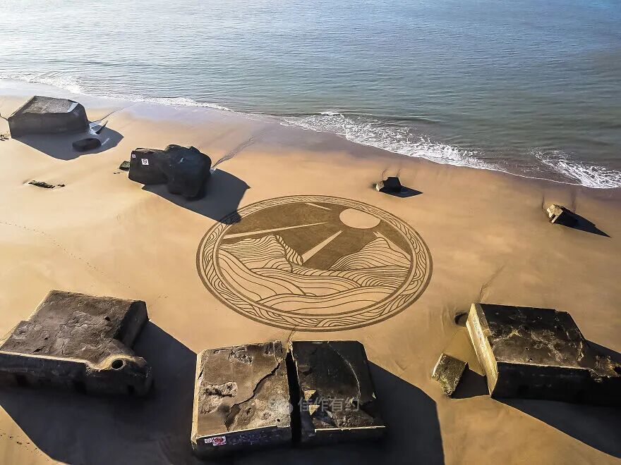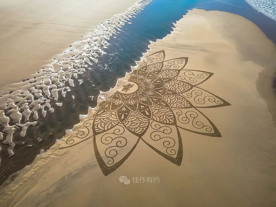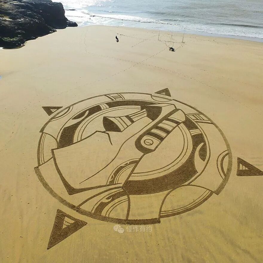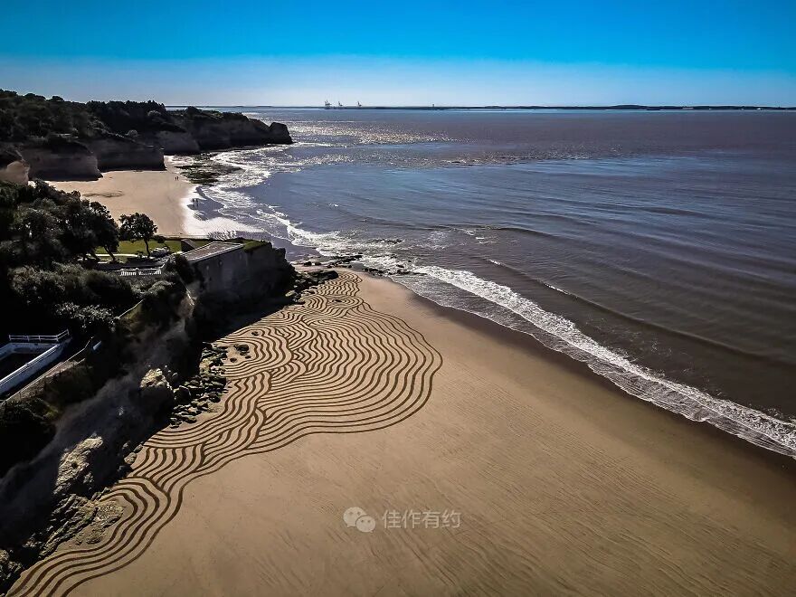 艺术总是无处不在,来自法国的艺术家Jben自2013年以来,一直在位于法国西海岸的鲁瓦扬的海滩上绘画。虽然他的作品只能保存4个小时,但这并影响他的创作,相反这更加激发了他的创作热情。艺术家Jben用无人机拍摄艺术作品,他的作品一般在 30 到 100 米之间,具体取决于复杂性和潮汐。他从来不用草稿,而是灵感来之后即兴创作,多年来在海滩上绘画成了他的全职工作。