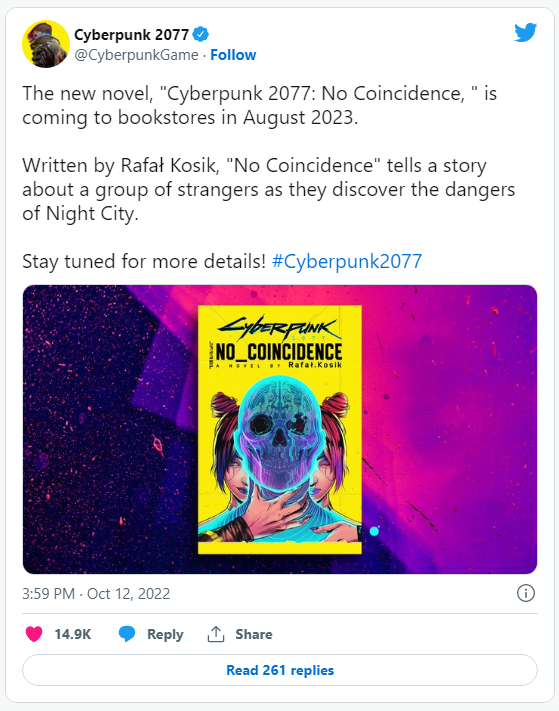 推文中写道:“新小说《赛博朋克2077:No Incidence》将于2023年8月登陆各大书店。由拉法尔-科西克(Rafał Kosik)撰写的这部小说将为大家讲述一群陌生人在夜之城内探索危险的故事,请继续关注更多细节”。