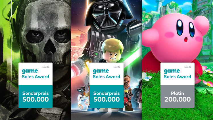 就在10月28日发布后的几天,《使命召唤》系列的最新游戏 《使命召唤:现代战争2》在德国的销量突破了50万大关。这款第一人称射击游戏在德国取得了巨大成功,并因此获得了游戏销售奖特别奖。动作冒险游戏 《乐高星战:天行者传奇》迎来了另一个成功:这个基于九部“星球大战”电影的游戏同样卖出了50多万份,也获得了一个特别奖。而今年上半年发售,关于粉红可爱主角的游戏《星之卡比:探索发现》的销量和热度在10月份仍然在上升,这款任天堂的作品取得了超过20万的销量,因此获得了游戏销售白金奖。