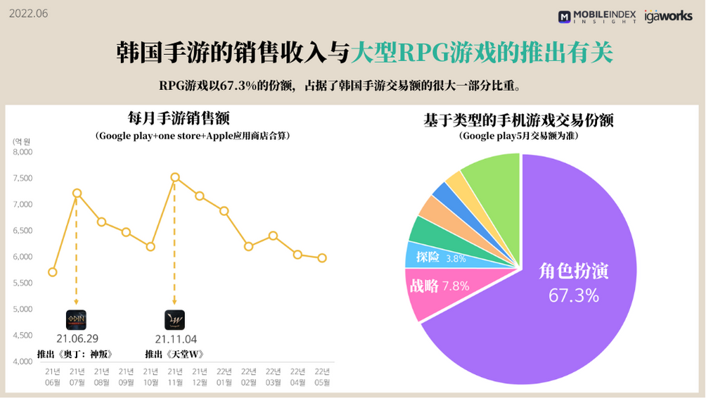 尽管RPG品类玩家流失严重,但该品类游戏在韩国手游市场仍占据很大的比重,在交易量中占到了67.3%。IGAWorks认为,大型RPG游戏的推出对韩国手游销售额的月度增长有很大贡献。这一年里,Kakao Games的《奥丁:神叛》以及11月的《天堂W》推出时,韩国手游的销售额都出现了大幅增长。