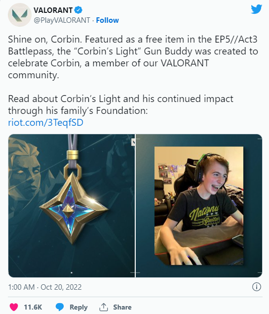 之前,拳头公司因致敬患癌症去世的《无畏契约》小粉丝,推出了一款名叫“Corbin’s Light”的枪械小挂件。现在,这款挂件能够在游戏的通行证中免费获得了。