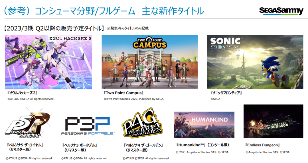 2022~2023财年的第二季度以后,世嘉将发行《灵魂骇客2》、《索尼克:未知边境》等新游戏。