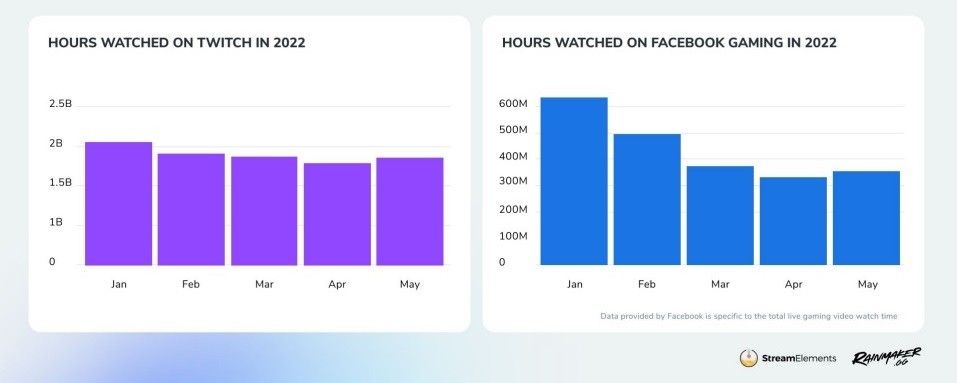 与去年同期相比,这两个游戏直播平台的观看时长都出现了明显的下滑,Twitch在2021年5月的看时为22亿小时,而Facebook Gaming则超过了4亿小时。