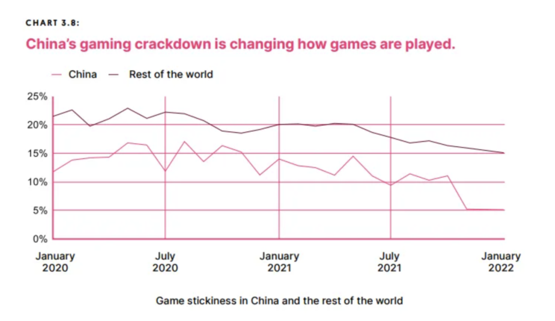 尽管世界其他地区的玩家粘性都有所下降,从17%的峰值下降到15%,但中国的用户粘性下降幅度格外让人瞩目,从16%左右下降到5%,并仍在持续。