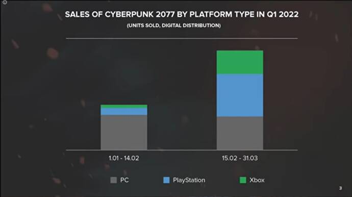 《赛博朋克2077》又一次迎来火热,这在很大程度上要归功于游戏在今年早些时候推出的免费PS5和Xbox X/S系列次世代版本升级。这一信息是CDPR在其季度业绩会议视频中披露的,在该会议中,总裁Adam Kiciński谈到了所有CDPR游戏的表现。 报告显示,《赛博朋克2077》在2022年第一季度实现了惊人的增长,增幅高达600%,其中大部分是在其推出次世代更新后所售出的。 有趣的是,你可以看到版本更新后PC、PS5和Xbox系列X/S的销量明细,目前看起来这些平台之间的销量相当平衡。而在更新之前,PC玩家贡献了大部分销量——可能因为它是游戏性能相对稳定的平台。而在更新之后,PS5和Xbox系列X/S的销量都有明显增长。 CDPR在发布会上也用一些时间专门介绍了与虚幻引擎的合作、目前开发团队正在进行的工作、公司利润和亏损数据等方面的内容。