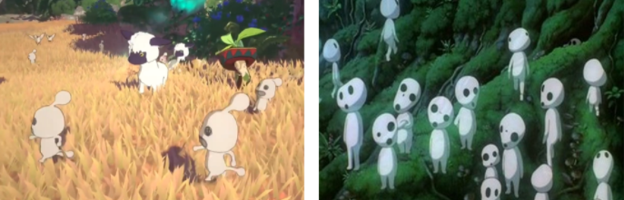 其一,在吉卜力风格的探索上,鲜有其他产品能超越二之国IP。通过海外版不难发现,初始角色中的剑士,几乎复刻了《哈尔的移动城堡》的男主角。游戏里的小精灵们与《幽灵公主》中的精灵对应;而王城中的猫咪守卫,也与吉卜力常用的动物拟人形象颇为相似。