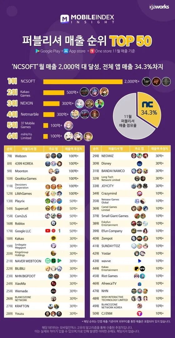 11月NCSoft一个月内的市场销售额便在2000亿韩元左右,占据整体份额的34.4%。紧跟其后的是Kakao Games 500亿韩元、Nexon 300亿韩元、Netmarble 300亿韩元、37手游100亿韩元。