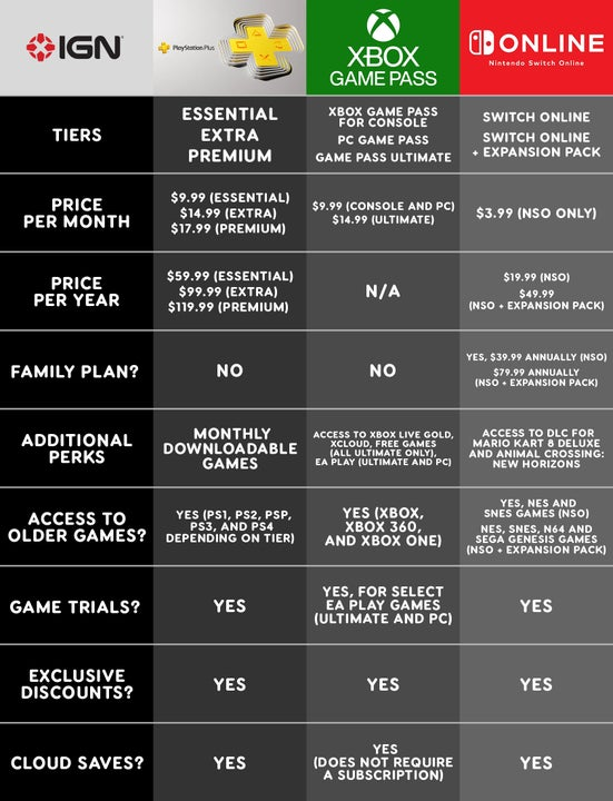 微软在其定价结构有所限制,因为其只提供按月和按季购买:Game Pass主机或PC Game Pass为9.99美元,终极版为14.99美元。按季度购买提供一些额外优惠。另一方面,任天堂比Game Pass有更多的购买选项,但比PlayStation Plus稍有限制。Switch Online是三者中最实惠的,个人会员费为每月3.99美元,每季为7.99美元,或整年19.99美元。
