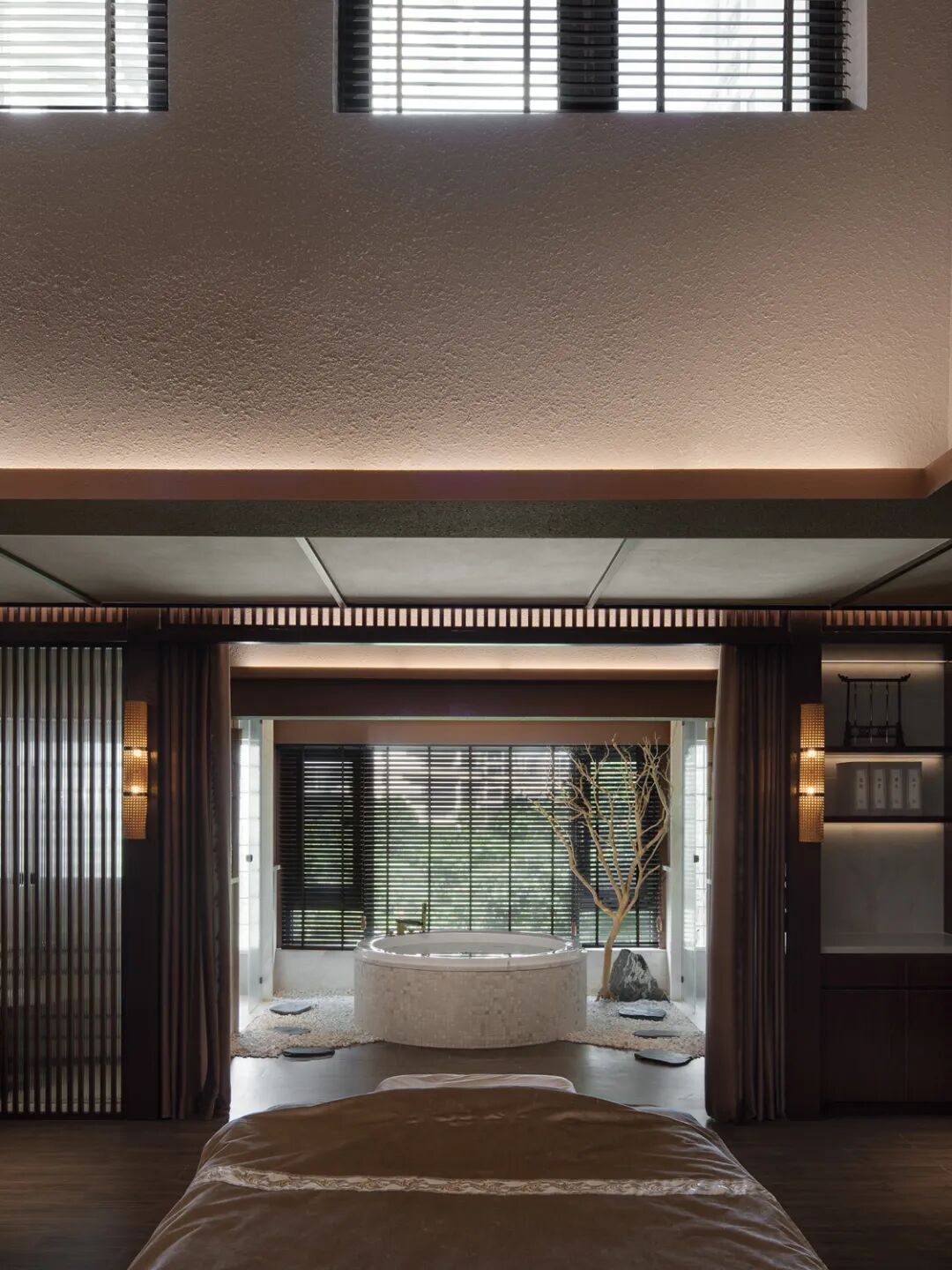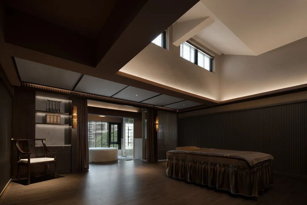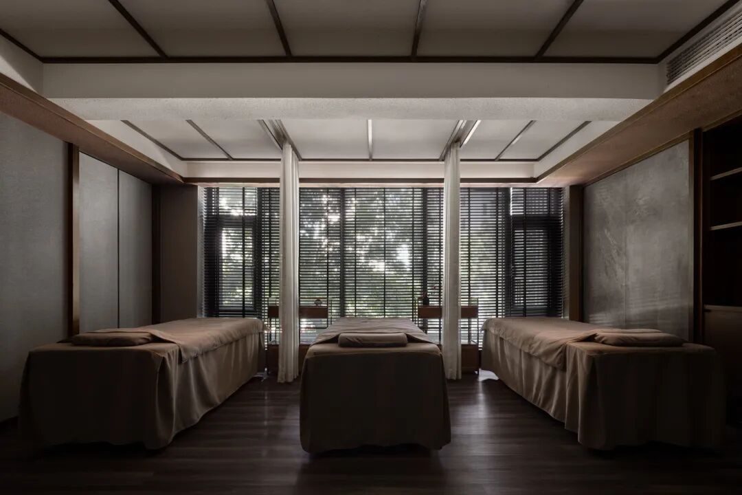 共同构建最隽永的情感归宿,或渗透,或开放,或独立。视线随之不断转折,每一个停留却都能窥到前方若隐若现的场景,穿梭过VIP通道来到顶层复式SPA包间,在被植物环绕的场域内与天地对话。