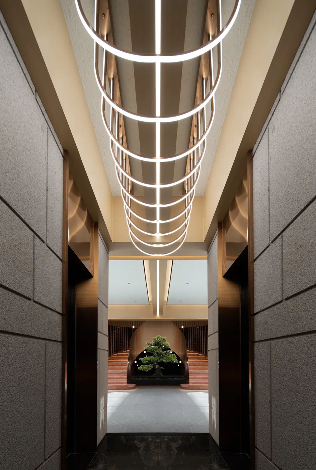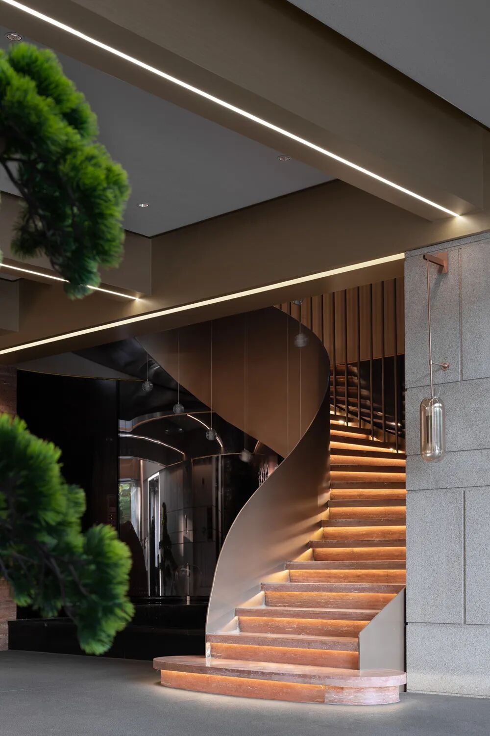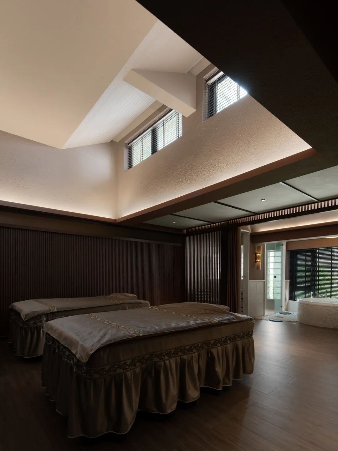 共同构建最隽永的情感归宿,或渗透,或开放,或独立。视线随之不断转折,每一个停留却都能窥到前方若隐若现的场景,穿梭过VIP通道来到顶层复式SPA包间,在被植物环绕的场域内与天地对话。