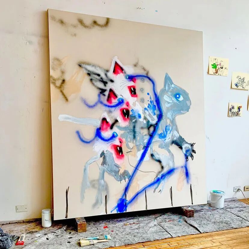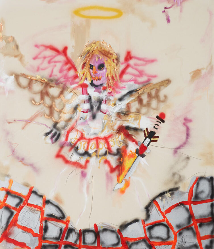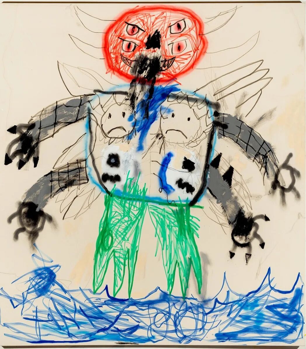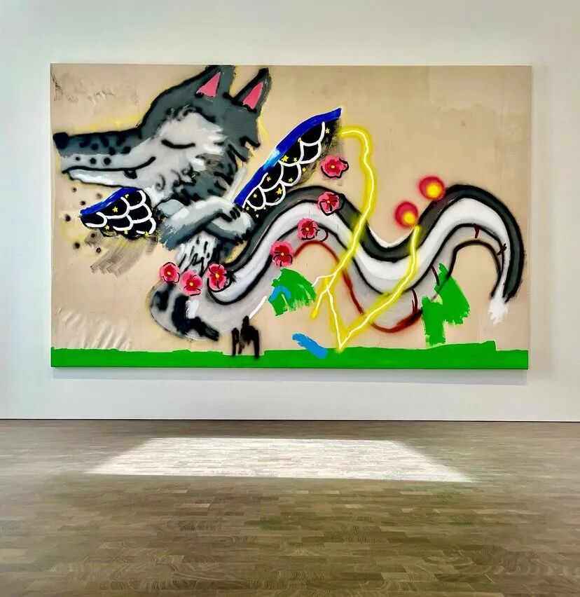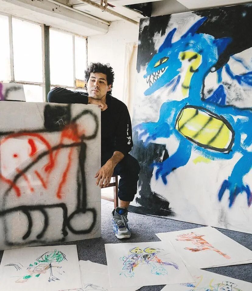 他独特的视觉语言极具个性,从苏美尔、埃及和玛雅艺术,到史前洞穴壁画,再到具有强大象征意义的曼陀罗,游戏图像和奇幻类型电影等流行文化隐喻,以童年无拘无束的想象力和涂鸦艺术融合起来,发展了 "坏 "画风格,形成既具有电音节律又充斥着魔法的虚幻世界,从而散发出一种俏皮的坦率,打破所谓高雅艺术的约束。