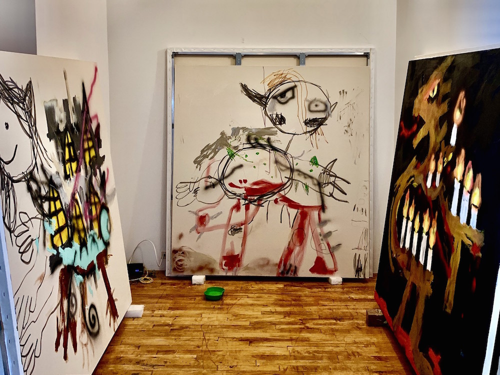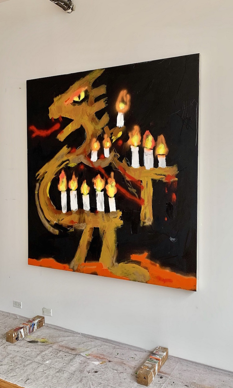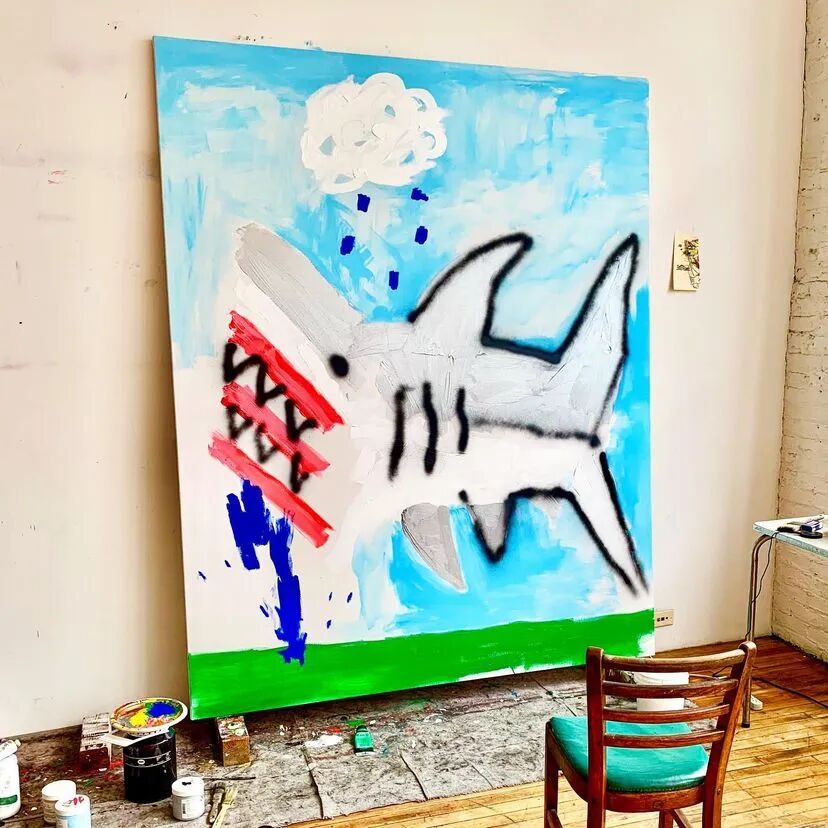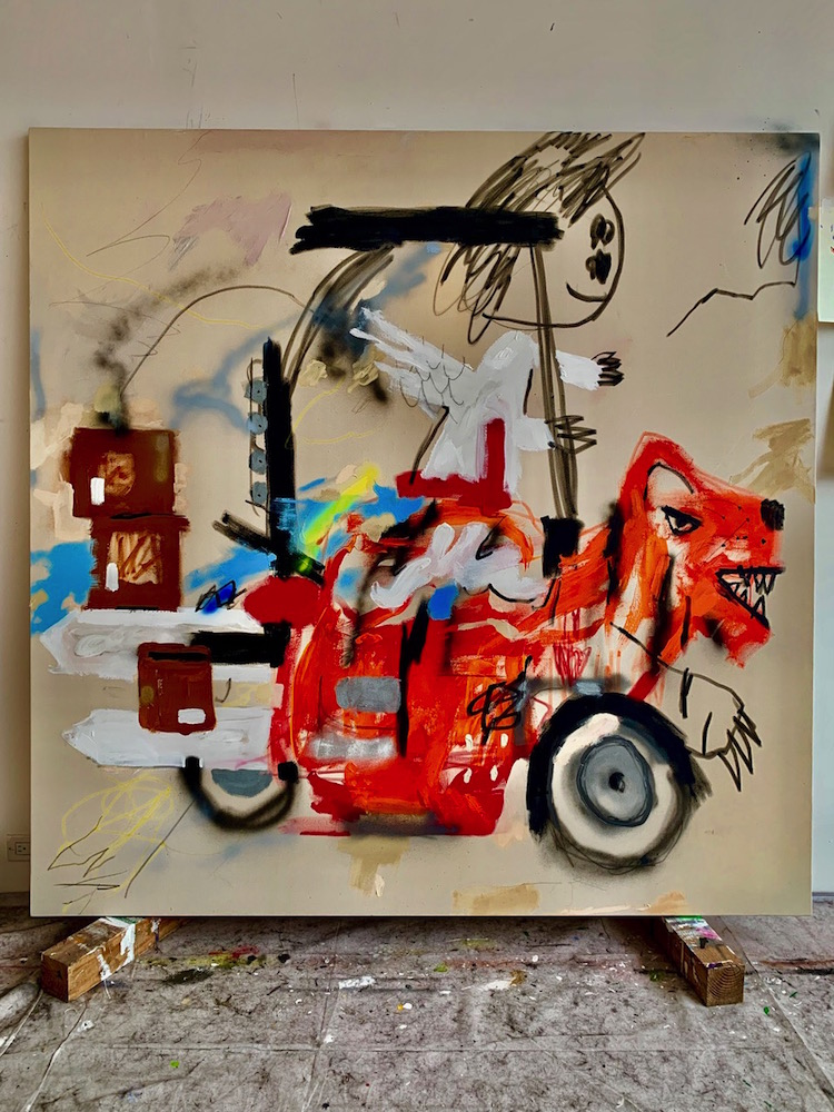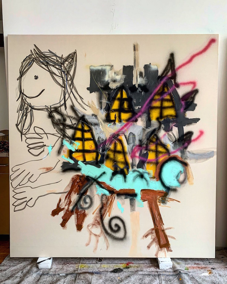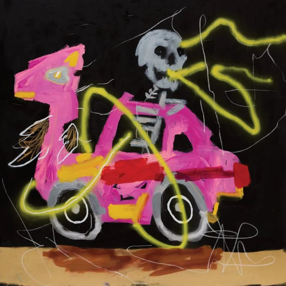 他独特的视觉语言极具个性,从苏美尔、埃及和玛雅艺术,到史前洞穴壁画,再到具有强大象征意义的曼陀罗,游戏图像和奇幻类型电影等流行文化隐喻,以童年无拘无束的想象力和涂鸦艺术融合起来,发展了 "坏 "画风格,形成既具有电音节律又充斥着魔法的虚幻世界,从而散发出一种俏皮的坦率,打破所谓高雅艺术的约束。