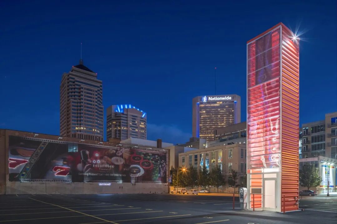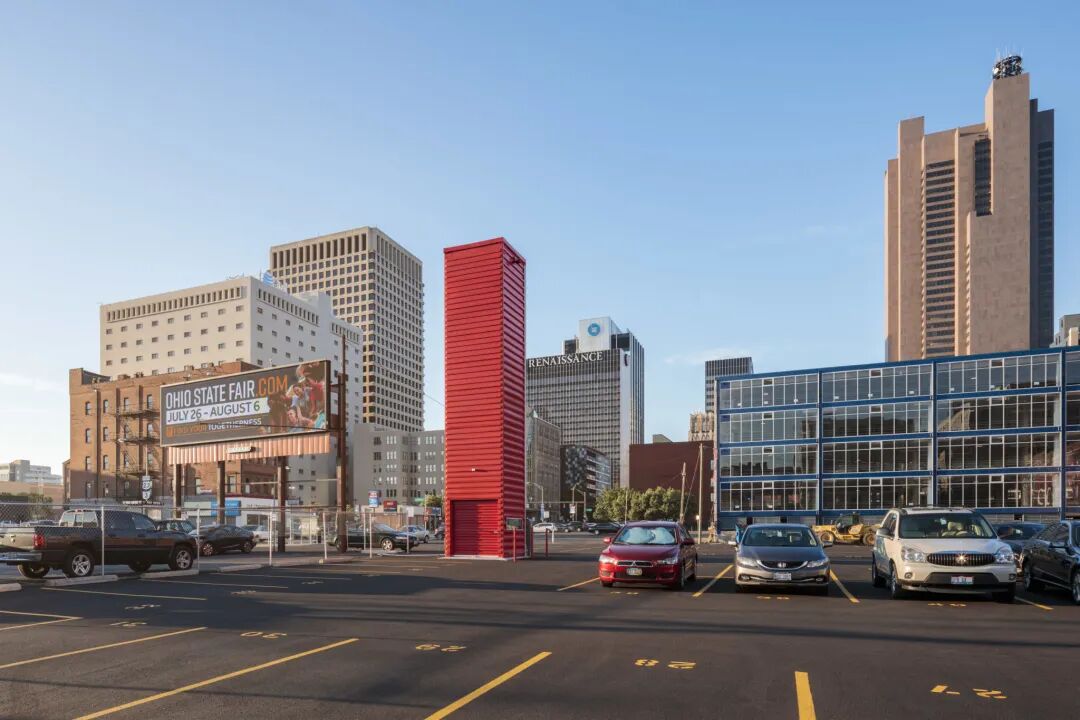 展位微塔是Bold Booth公共艺术项目的一个补充部分。JBAD的集装箱设计将服务员的停车位重新打造为城市天际线上的一座新塔,从而重新构造一个典型的普通停车位。停车位凭借其整体性,模仿周围的办公大楼,同时成为社区的视觉地标。