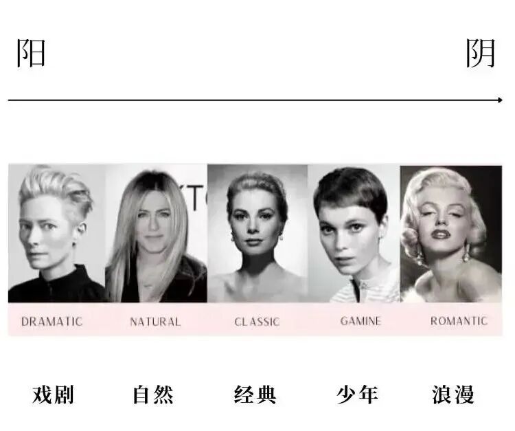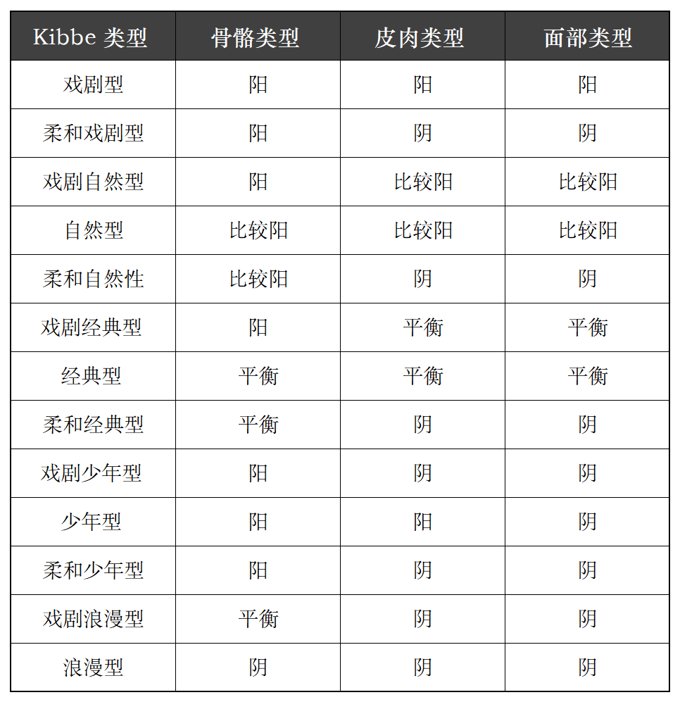 “Kibbe身材分类法”借用了中国传统的“阴阳”概念来描述一些身形上的特点,比如高挑的身高、宽大的骨架、利落的直线条和锐利的棱角是阳性特质,圆润、娇小的身形,柔和的曲线,精细的骨架是阴性特质。Kibbe类型从身体阴阳特质的多少出发,综合身形、骨骼结构、肢体长度、皮肉情况、面部轮廓等不同方面分析女性的身材特质,区分了戏剧型、自然型、经典型、少年型和浪漫型五个基本身材类型。