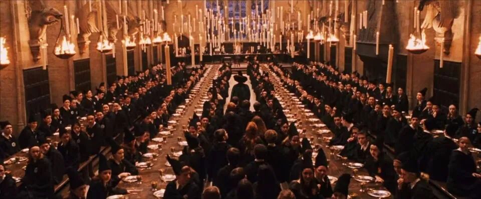 在《哈利·波特与魔法石》中,罗琳仅用几句有效的话,就成功地在老少皆宜的心目中塑造了一个独特而标志性的环境。“大厅被成千上万的蜡烛照亮,这些蜡烛漂浮在半空中,四张长桌上方,其余的学生都坐在那里,天鹅绒般的黑色天花板上点缀着星星。”
