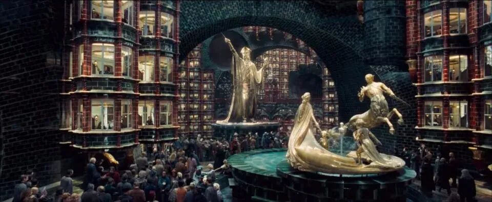 我们必须提到魔法部的建筑重要性,它就像古灵阁一样,这座建筑也与传奇中更“成人”的一面有关,因此更加简朴、不那么丰富多彩也不那么欢乐。深色的木墙,巫师们进出的绿色火焰,以及魔法部的金色徽章是唯一可见的颜色,而外面的世界却无法具体感知它的存在,整个空间散发出官僚主义凌驾于人类生活之上的理念。